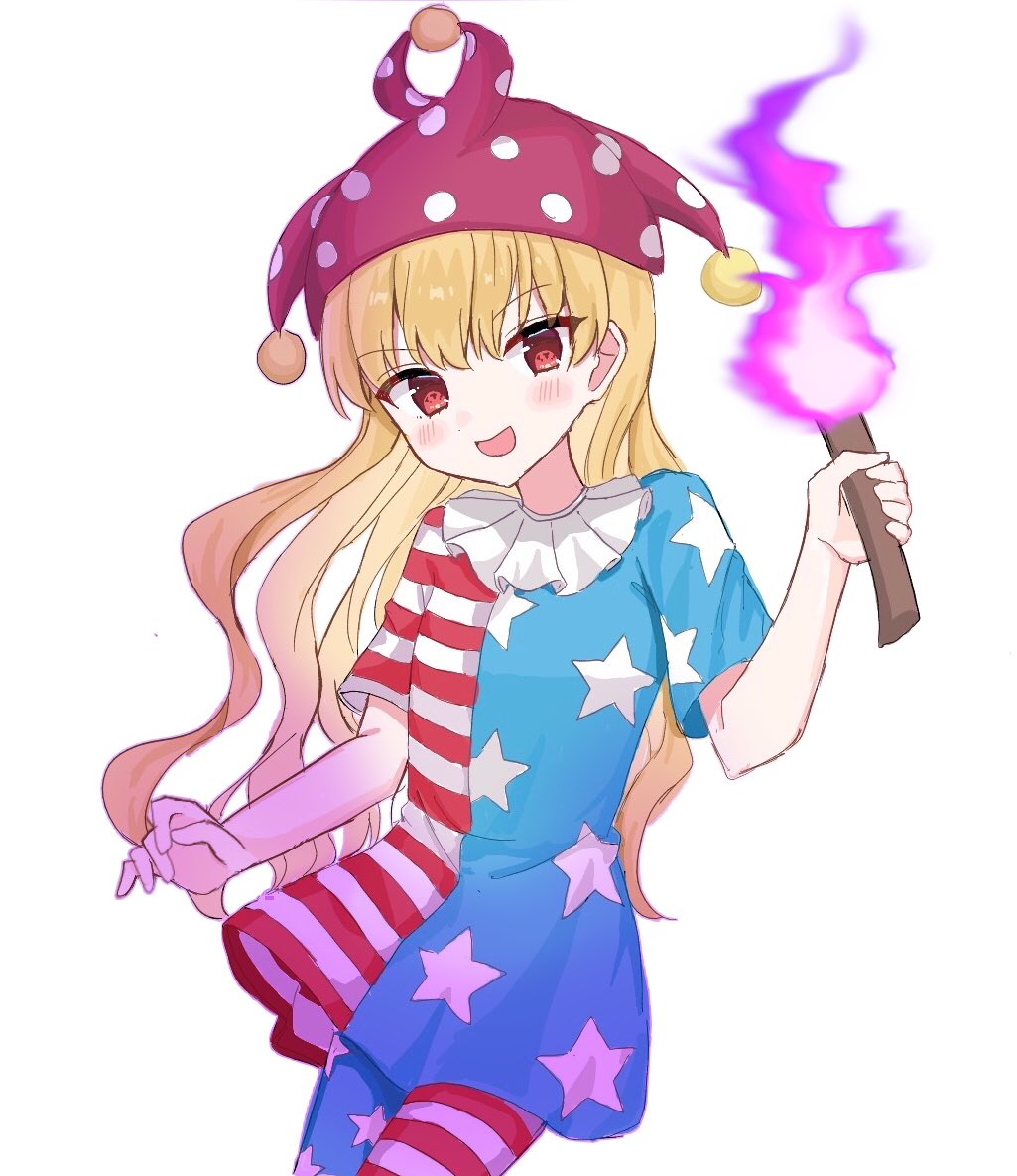 1girl american_flag_dress american_flag_legwear beads blonde_hair blush clownpiece cowboy_shot dress fire hair_between_eyes hand_up hasegawa_06 hat holding holding_torch jester_cap long_hair looking_at_viewer neck_ruff open_mouth pantyhose polka_dot_headwear purple_fire purple_hat red_eyes short_sleeves simple_background smile solo standing star_(symbol) star_print striped_clothes striped_dress striped_pantyhose torch touhou wavy_hair white_background