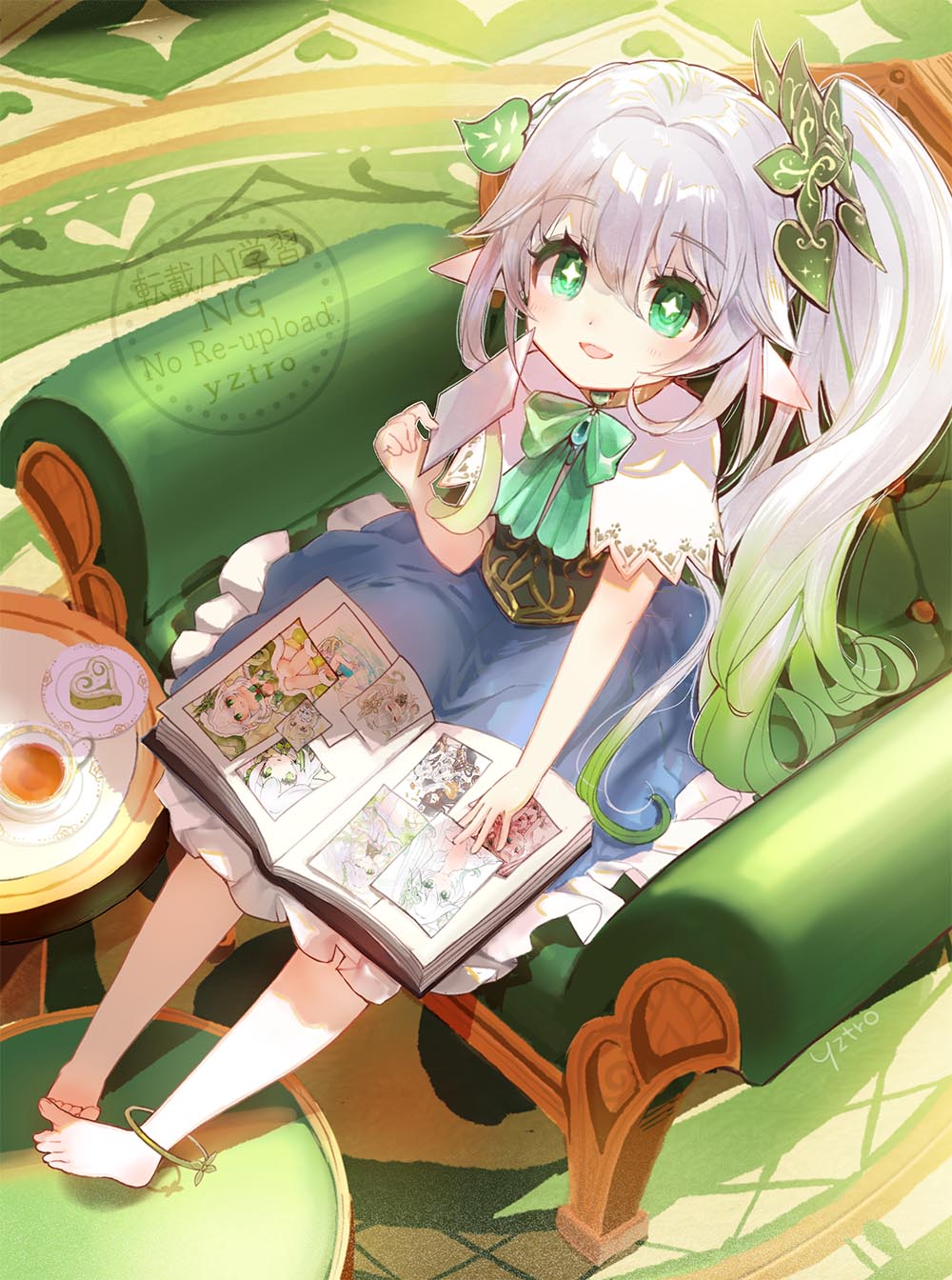 1girl alternate_costume artist_name barefoot blush book bow bowtie commentary_request couch cup dress genshin_impact gradient_hair green_bow green_bowtie green_eyes green_hair hair_between_eyes hair_ornament heart highres holding holding_photo indoors leaf_hair_ornament long_hair looking_at_viewer multicolored_hair nahida_(genshin_impact) open_book parted_lips photo_(object) pointy_ears saucer side_ponytail sitting solo star-shaped_pupils star_(symbol) symbol-shaped_pupils teacup toes toro_astro white_hair