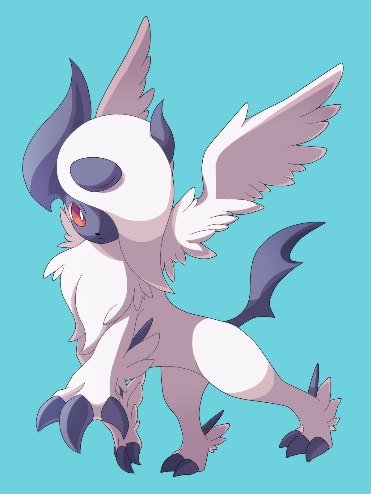 absol blue_background claws closed_mouth commentary_request full_body gen_3_pokemon hair_over_one_eye highres mega_absol mega_pokemon nintendo no_humans pokemon pokemon_(creature) simple_background solo yon_(4km_105)