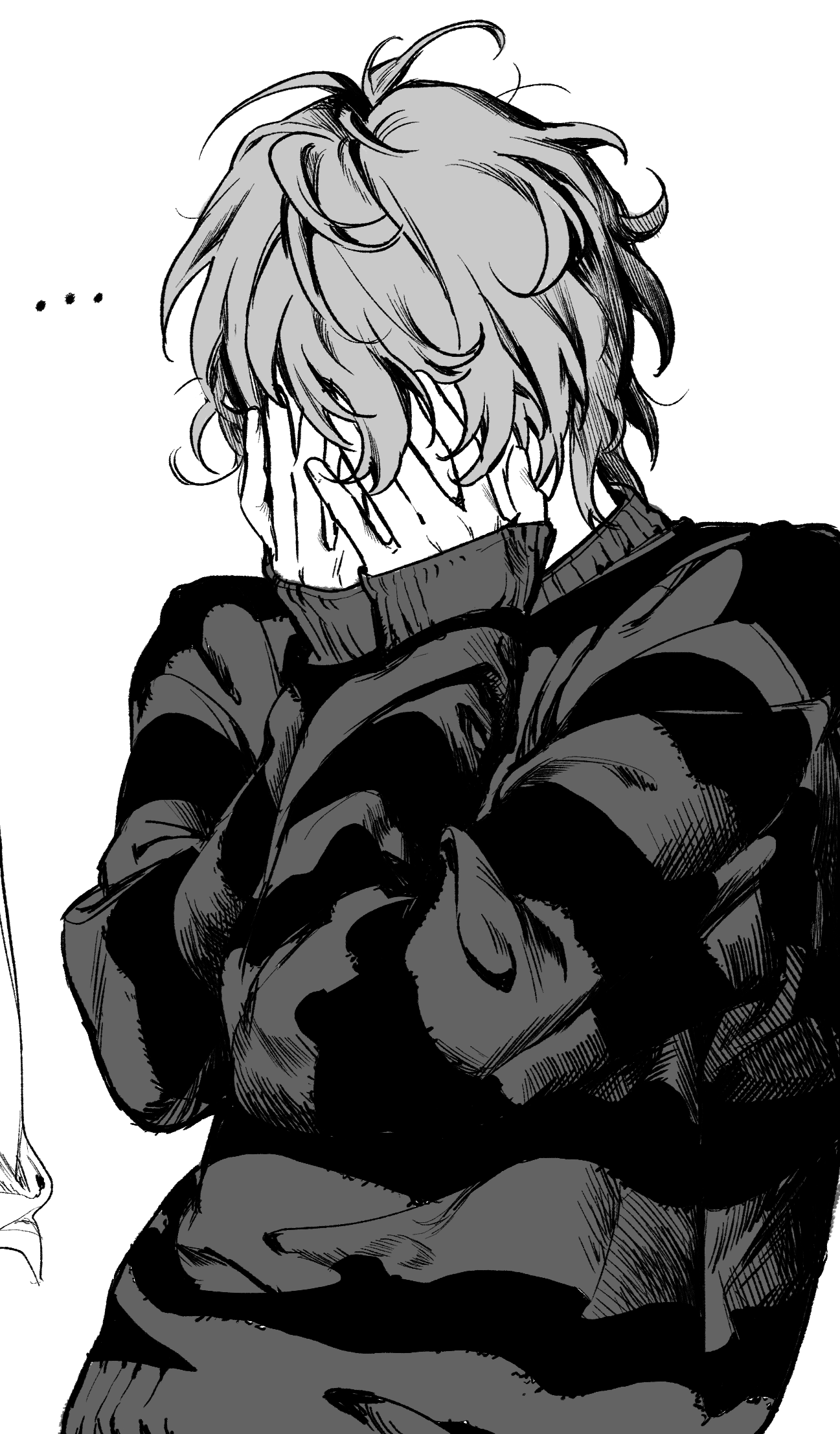 ... 1boy akechi_gorou covering_own_eyes cowboy_shot greyscale highres long_sleeves male_focus monochrome persona persona_5 rainbubble_88 short_hair simple_background sleeves_past_wrists solo striped_clothes striped_sweater sweater wavy_hair white_background