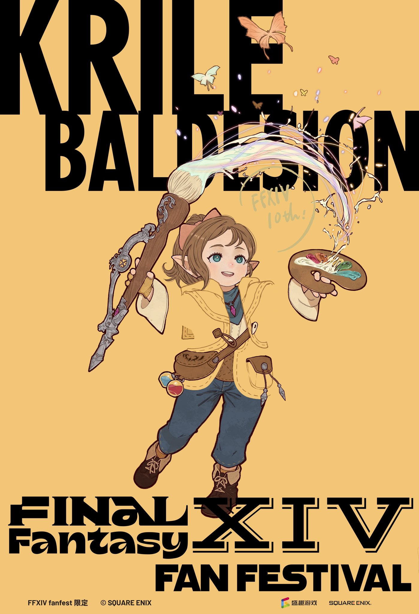 1girl blending blue_pants bow brown_hair brown_shoes bug butterfly character_name final_fantasy final_fantasy_xiv hair_bow highres holding holding_paintbrush insect krile_baldesion_(ff14) paintbrush pants pink_bow pointy_ears ponytail shoes solo syooooyoooo white_paint yellow_background