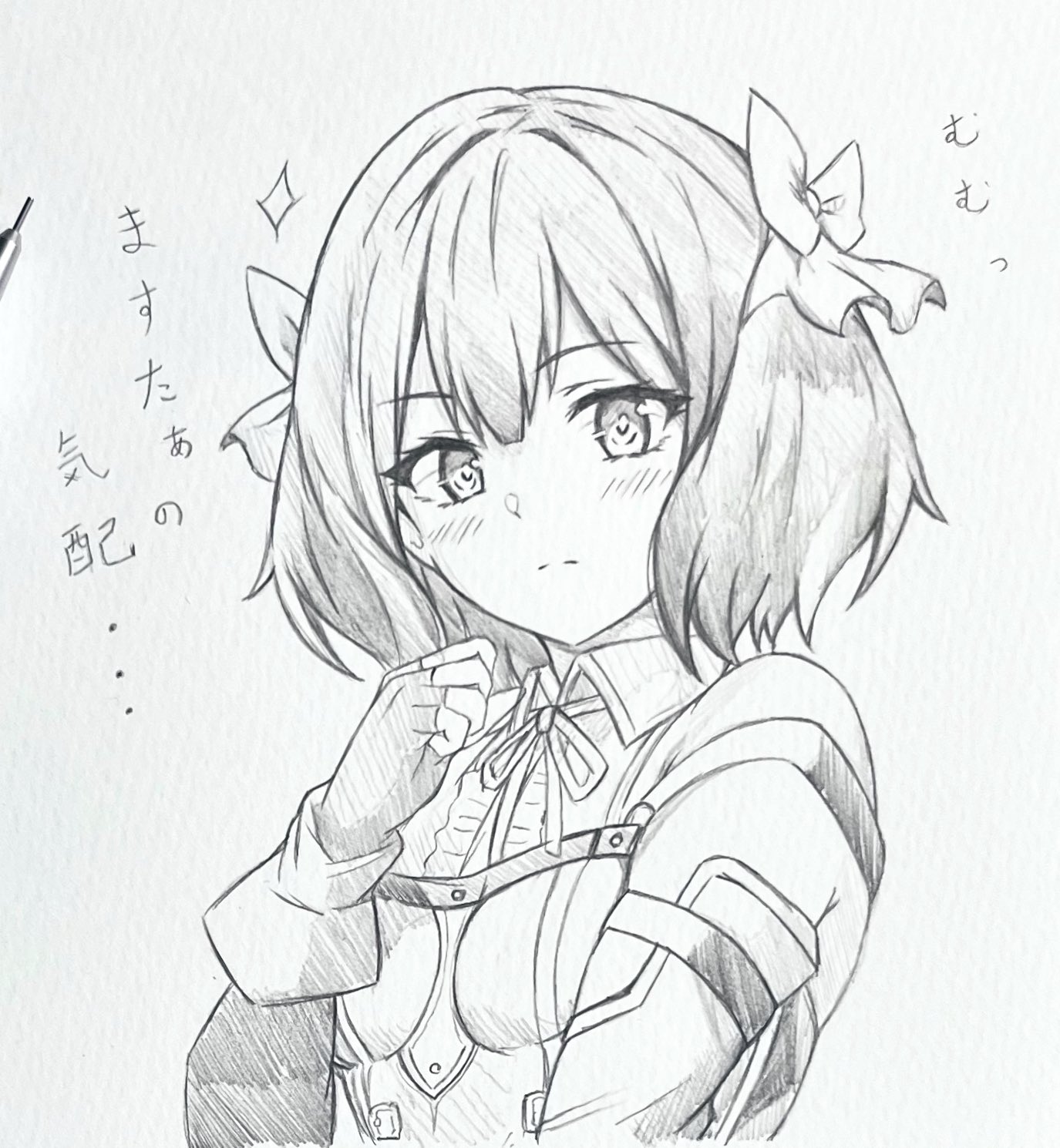 ... 1girl art_tools_in_frame bow closed_mouth double-parted_bangs eyelashes fingerless_gloves gloves graphite_(medium) greyscale hair_bow highres looking_at_viewer monochrome multiple_hair_bows nageki_no_bourei_wa_intaishitai ribbon seishun_dendeke solo tino_shade traditional_media translation_request upper_body