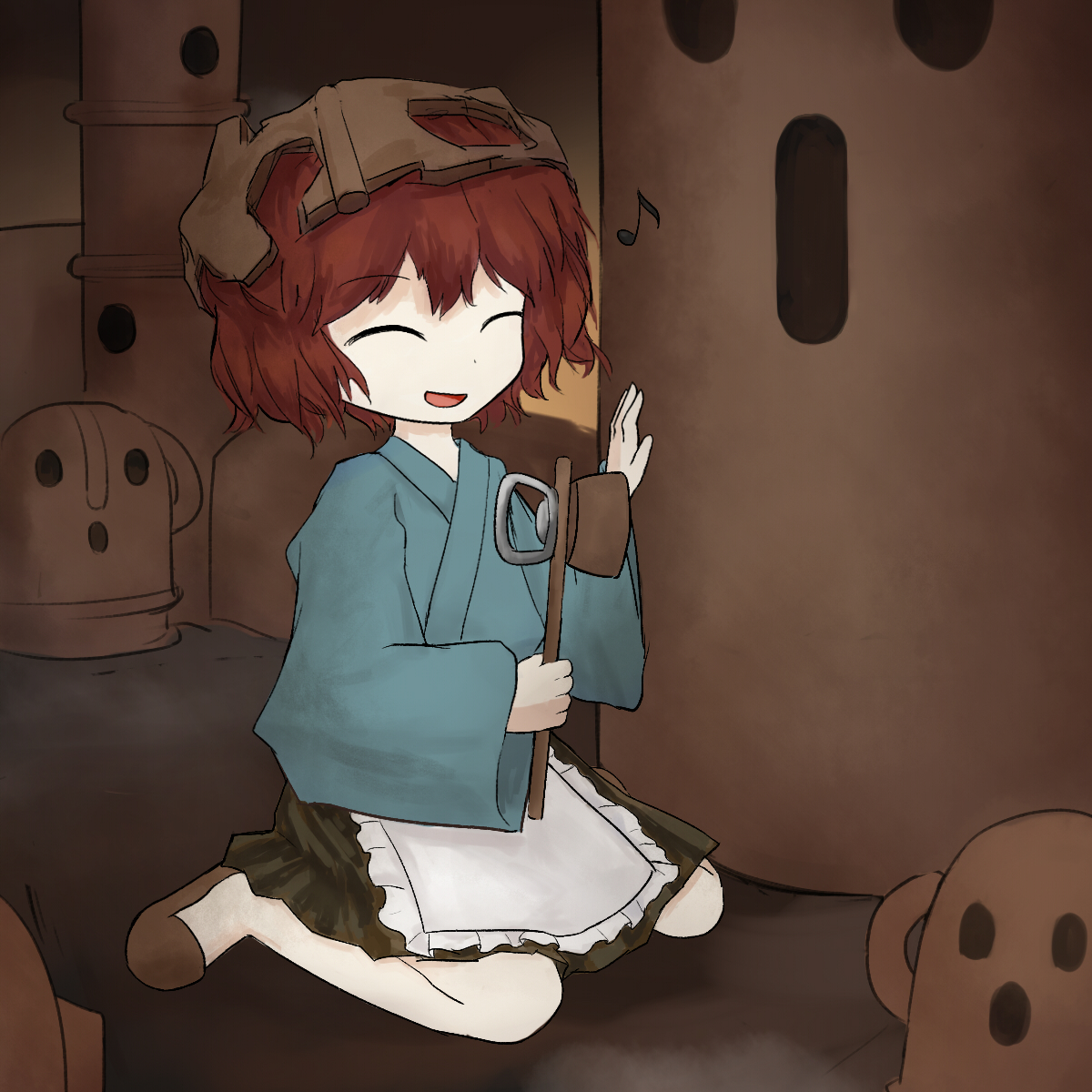 1other ^_^ androgynous apron bare_legs blue_kimono bottle_opener brown_hakama brown_helmet brown_slippers closed_eyes dot_nose frilled_apron frills full_body hair_between_eyes hakama hakama_short_skirt hakama_skirt hammer haniwa_(statue) happy helmet highres holding holding_hammer indoors japanese_clothes katano_sukune katano_sukune's_bottle_opener kimono kneeling kuroda_(kurota_ne) len'en musical_note official_style open_mouth other_focus red_hair short_hair short_kimono skirt slippers smile solo waist_apron white_apron