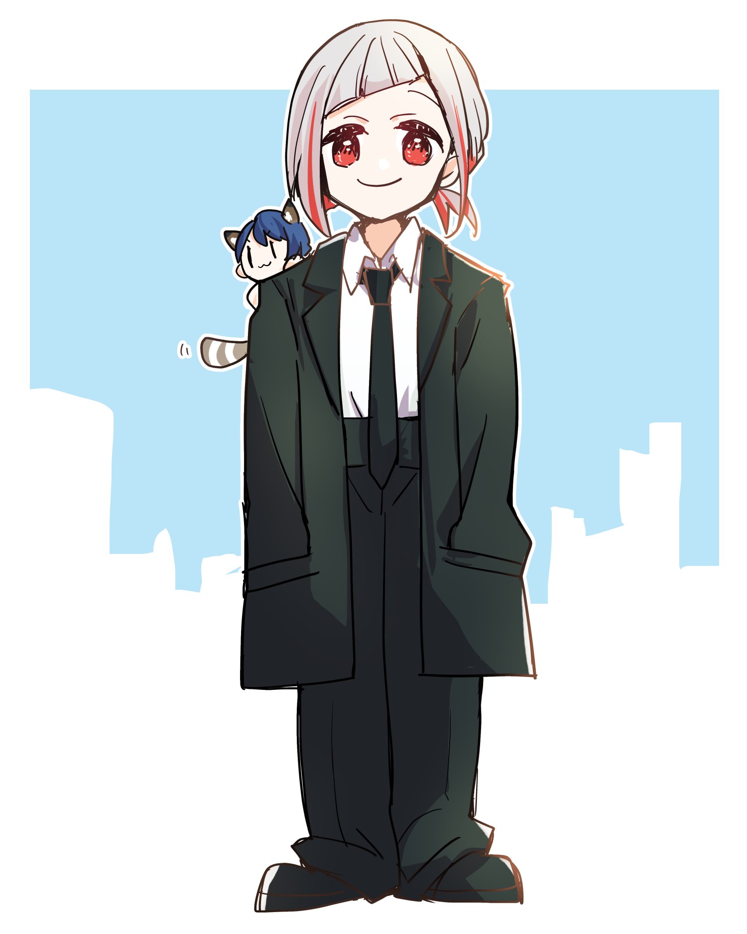 2girls :3 black_jacket black_necktie black_pants black_shoes blue_background blue_hair closed_mouth collared_shirt commentary_request dress_shirt full_body grey_hair hands_in_pockets highres jacket kanduki_kamibukuro light_particles link!_like!_love_live! long_sleeves love_live! mini_person minigirl multicolored_hair multiple_girls murano_sayaka necktie oversized_clothes pants person_on_shoulder ponytail red_eyes red_hair red_panda_ears red_panda_girl red_panda_tail shirt shoes short_ponytail simple_background standing straight-on streaked_hair two-tone_hair v-shaped_eyebrows virtual_youtuber white_background white_shirt yugiri_tsuzuri |_|