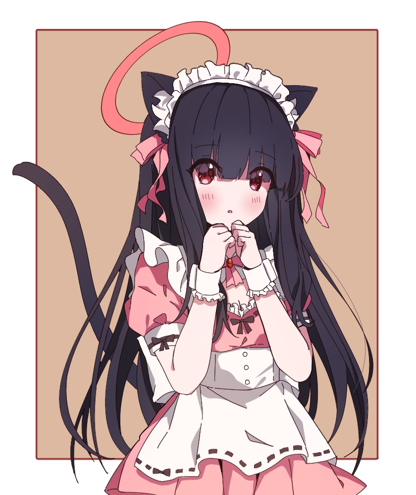 1girl animal_ears apron black_hair blue_archive blunt_bangs breasts brown_background cat_ears cleavage commentary_request dress eyes_visible_through_hair frilled_wrist_cuffs frills glimer3048 hair_over_eyes hair_ribbon halo hands_up justice_task_force_member_(blue_archive) justice_task_force_member_(maid)_(blue_archive) korean_commentary long_hair looking_at_viewer maid maid_apron maid_headdress official_alternate_costume pink_dress pink_ribbon puffy_short_sleeves puffy_sleeves red_eyes red_halo ribbon short_sleeves simple_background white_apron wrist_cuffs