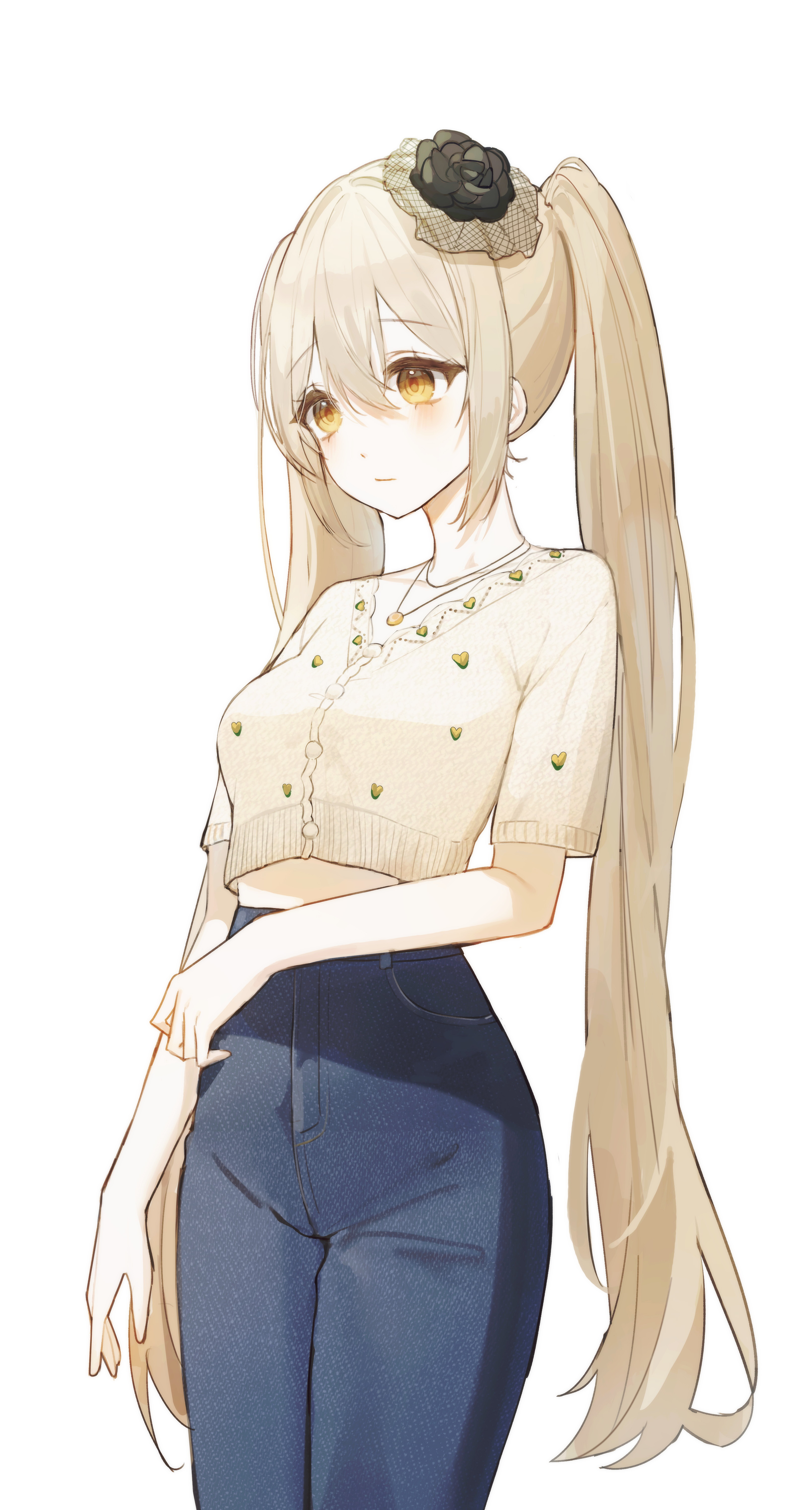 1girl absurdres blonde_hair blue_pants boong0619 breasts commission cowboy_shot crop_top denim flower hair_flower hair_ornament high-waist_pants highres jeans jewelry long_hair looking_ahead midriff necklace original pants shirt short_sleeves simple_background small_breasts solo twintails very_long_hair white_background white_shirt yellow_eyes