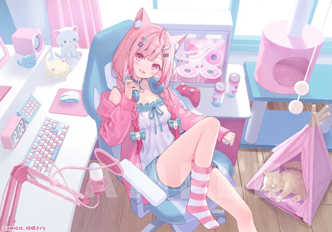 1girl animal_ear_fluff animal_ears cat cat_ears cat_girl chair fukahire_(ruinon) hair_ornament headphones headphones_around_neck heart heart_hair_ornament indie_virtual_youtuber indoors jacket long_hair long_sleeves on_chair open_mouth pink_hair pink_jacket ribbon shorts sitting smile socks solo striped_clothes striped_socks virtual_youtuber wing_hair_ornament yuuki_sakuna