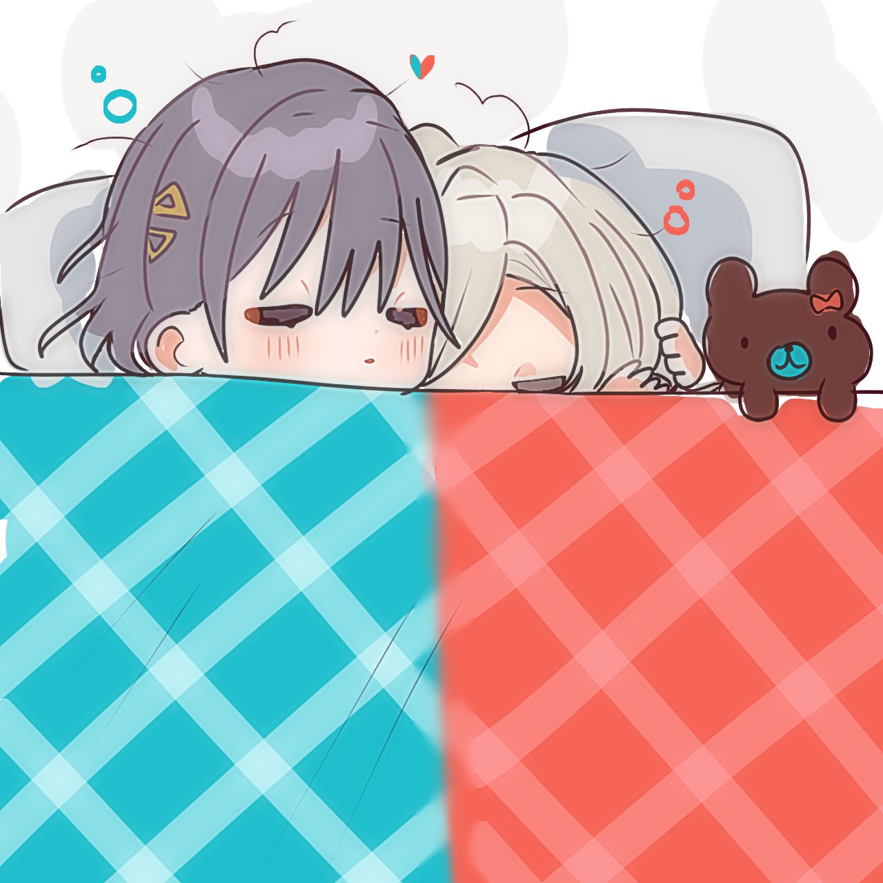 2girls blush ceras_yanagida_lilienfeld closed_eyes closed_mouth col_person commentary edel_note grey_hair hair_ornament heart highres hug katsuragi_izumi link!_like!_love_live! love_live! multiple_girls sleeping sleeping_together squeans stuffed_animal stuffed_toy untranslatable_commentary teddy_bear triangle_hair_ornament under_covers virtual_youtuber yuri