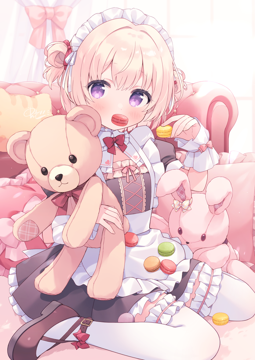 1girl apron black_dress couch dress holding_stuffed_toy kano_hito looking_at_viewer maid maid_headdress mouth_hold on_couch original pink_hair pink_ribbon purple_eyes ribbon sitting solo stuffed_toy wariza white_apron