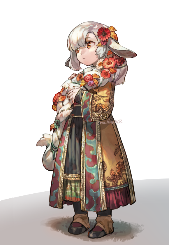 1girl animal_ears black_dress black_shoes braid clothing_request commentary dress floral_print flower full_body goat_ears hair_flower hair_ornament hair_over_shoulder holding holding_own_hair horizontal_pupils long_hair long_sleeves mole mole_under_eye mullmull02 orange_eyes original print_dress red_flower shoes simple_background single_braid solo standing untranslatable_commentary white_flower yellow_dress