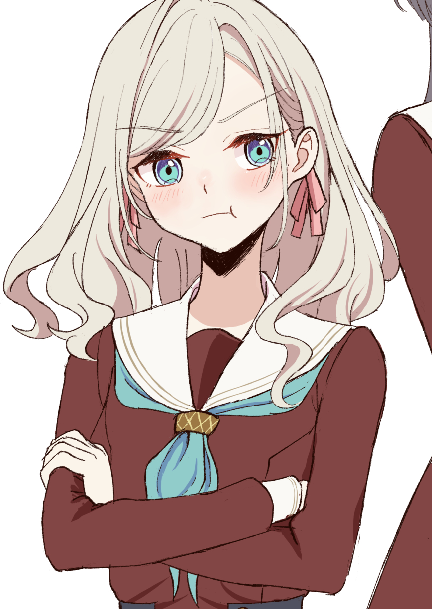 2girls :t aqua_neckerchief blue_eyes blush brown_dress ceras_yanagida_lilienfeld commentary_request crossed_arms dress grey_hair hair_ribbon hasu_no_sora_school_uniform highres katsuragi_izumi link!_like!_love_live! long_sleeves love_live! multiple_girls neckerchief out_of_frame pink_ribbon pout ribbon sailor_collar sailor_dress school_uniform simple_background solo_focus upper_body v-shaped_eyebrows virtual_youtuber wachida_01d white_background white_sailor_collar winter_uniform