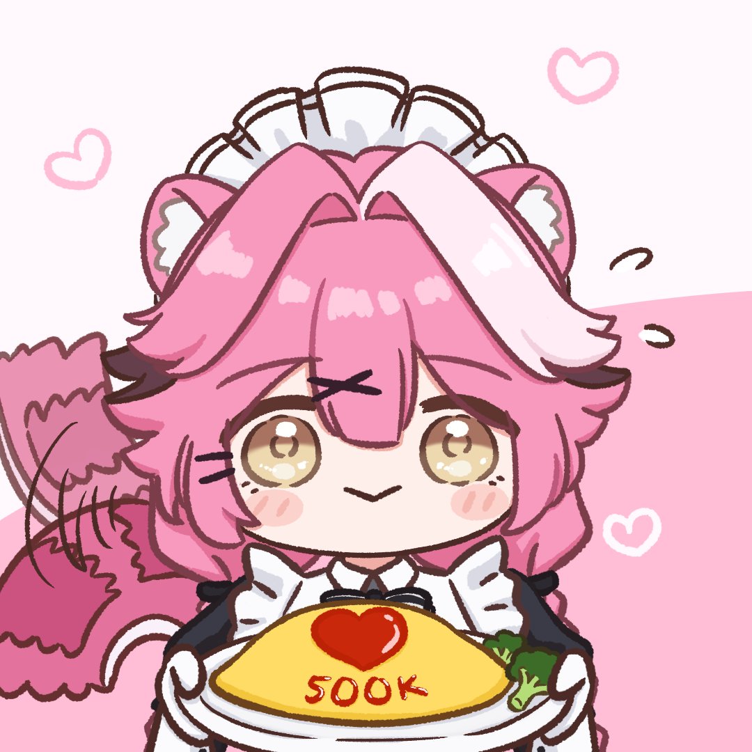 1girl :> animal_ears apron black_bow black_bowtie black_fire blush blush_stickers bow bowtie braid broccoli chibi chibi_only closed_mouth commentary english_commentary fire flying_sweatdrops food gloves hair_intakes hair_ornament hairclip heart holding holding_plate hololive hololive_english long_hair looking_at_viewer maid maid_apron maid_headdress motion_lines multicolored_hair omelet panther_ears panther_girl panther_tail pink_background pink_hair plate raora_panthera raora_panthera_(maid) smile solo streaked_hair summer_floofy tail tail_wagging tamagoyaki twin_braids twintails two-tone_background virtual_youtuber white_gloves yellow_eyes
