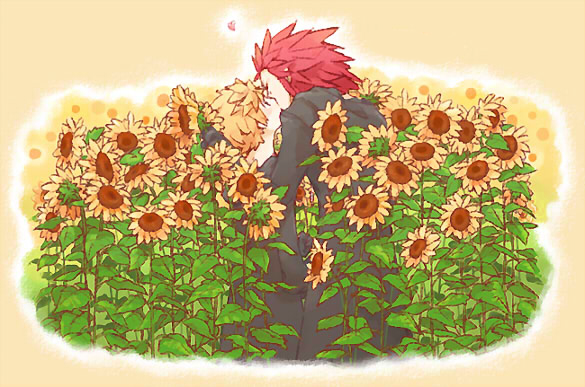 2boys axel_(kingdom_hearts) black_coat black_coat_(kingdom_hearts) black_gloves blonde_hair blue_eyes closed_eyes coat commentary_request couple facial_mark field flower flower_field gloves heart height_difference kingdom_hearts kiss leaf long_sleeves looking_at_another looking_up male_focus medium_hair multiple_boys outline red_hair roxas spiked_hair spoken_heart standing sunflower upper_body white_outline yaoi yellow_background yellow_flower yubon