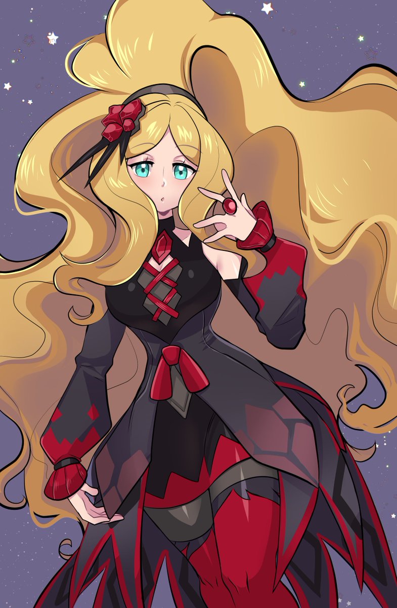 1girl black_dress black_hairband blonde_hair caitlin_(fall_2021)_(pokemon) caitlin_(pokemon) commentary cowboy_shot detached_sleeves dress english_commentary green_eyes hair_ornament hairband high_ponytail highres jewelry long_hair long_sleeves looking_at_viewer missandydandy night nintendo official_alternate_costume official_alternate_hairstyle parted_lips pokemon pokemon_masters_ex ponytail puffy_sleeves red_thighhighs ring solo thighhighs very_long_hair
