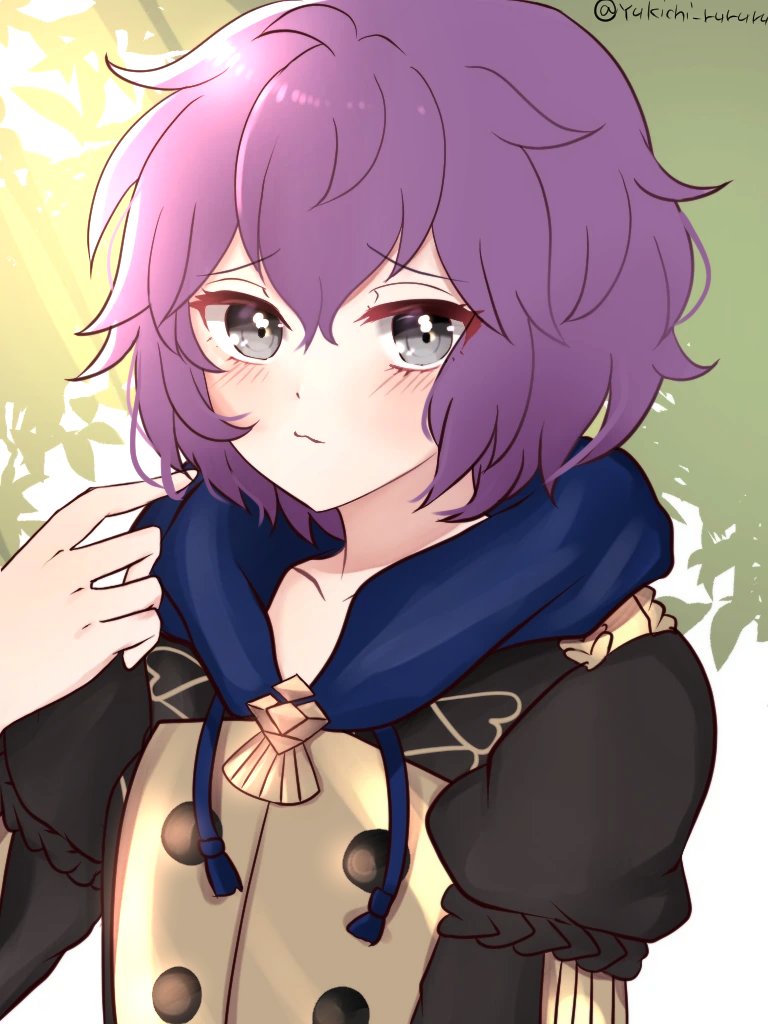 1girl :3 bernadetta_von_varley blush buttons closed_mouth commentary_request fire_emblem garreg_mach_monastery_uniform grey_eyes hair_between_eyes hood hood_down juliet_sleeves long_sleeves looking_at_viewer nintendo puffy_sleeves purple_hair short_hair solo twitter_username yukichi_(yukichi_rururu)