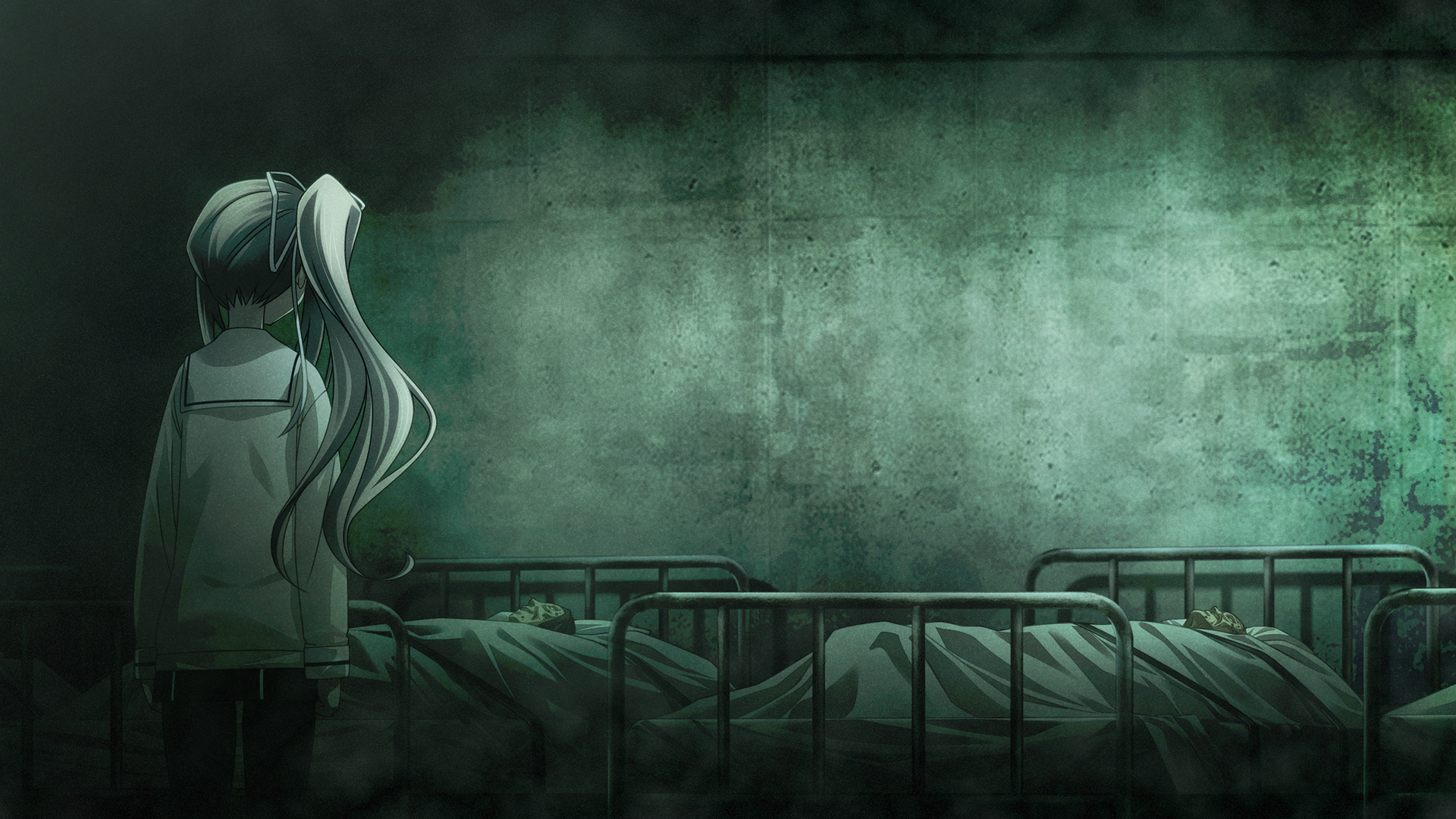 1girl 2others asymmetrical_sidelocks bed black_pantyhose blazer blonde_hair chaos;child chaos_child_syndrome clenched_hands dark dim_lighting from_behind game_cg hair_ribbon hekiho_academy hekiho_academy_school_uniform highres hospital hospital_bed jacket looking_at_another miniskirt multiple_others nape official_art one_side_up pantyhose ribbon sailor_collar sasaki_mutsumi science_adventure side_ponytail sidelocks skirt under_covers white_ribbon white_sailor_collar yamazoe_uki yellow_jacket