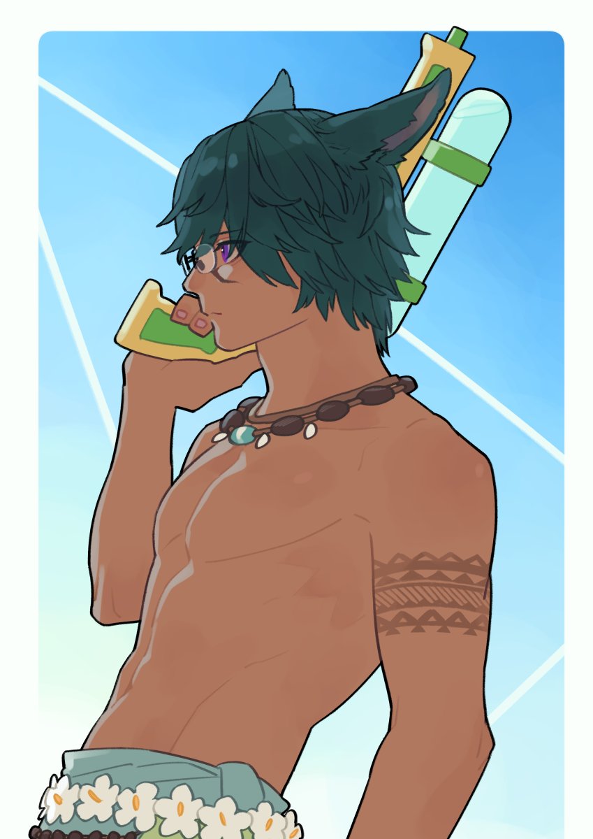 1boy abs animal_ears arm_tattoo arm_up blue_eyes blue_sky border cat_ears closed_mouth cowboy_shot dark-skinned_male dark_skin final_fantasy final_fantasy_xiv flower glasses green_hair highres holding holding_water_gun jewelry koana_(ff14) looking_ahead male_focus miqo'te necklace pectorals pince-nez profile sky solo summer tattoo toned toned_male topless_male water_gun white_border white_flower yama37