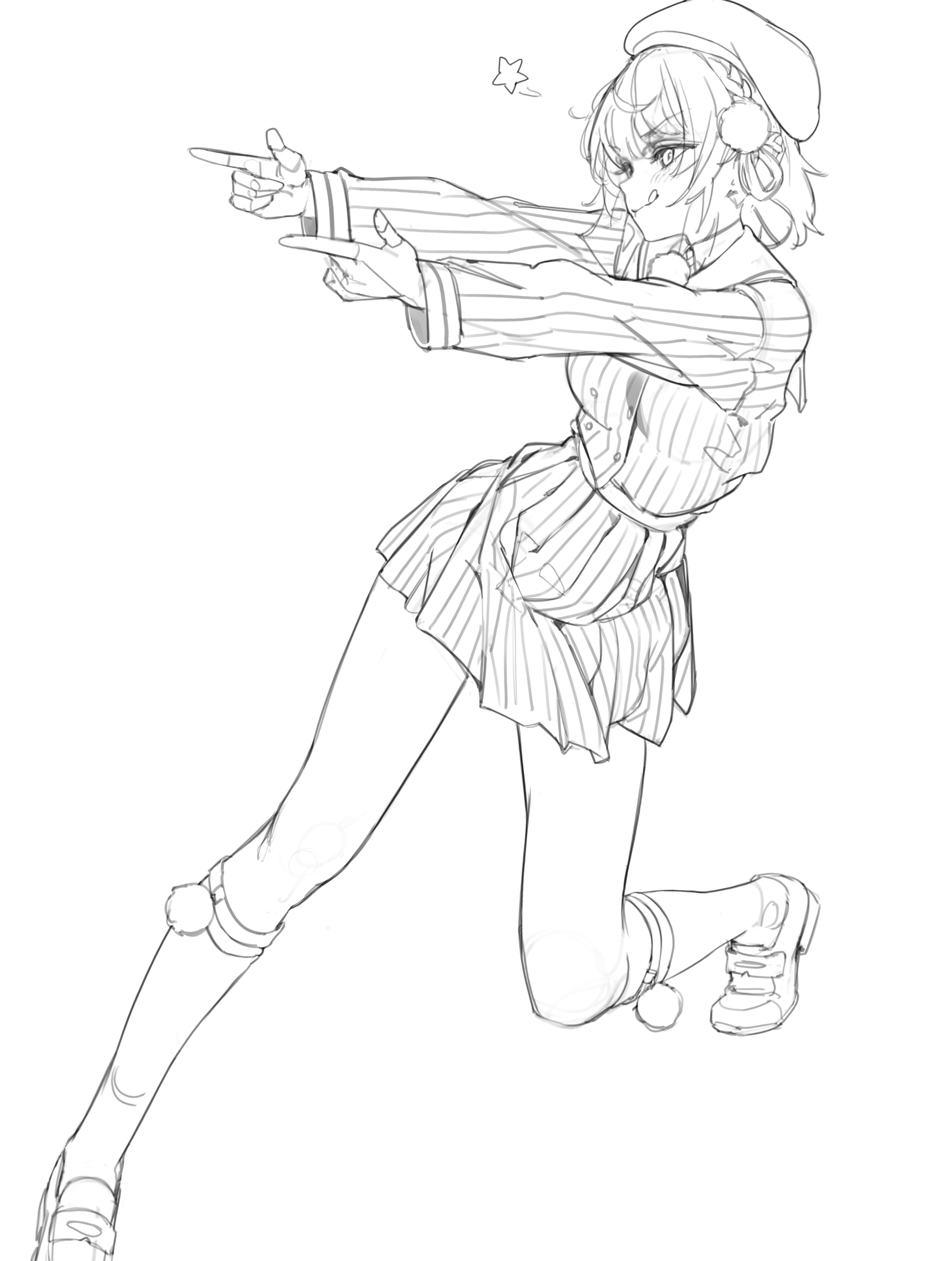 1girl absurdres finger_gun from_side gjz1227 hat highres indie_virtual_youtuber long_sleeves monochrome shigure_ui_(vtuber) sketch solo tongue tongue_out virtual_youtuber