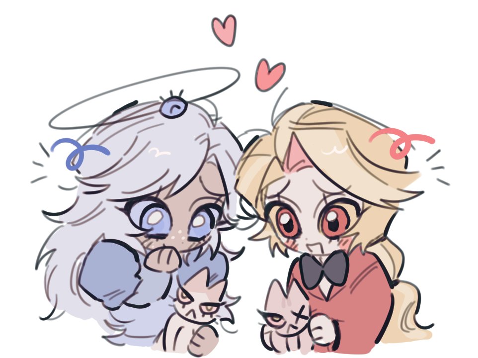 2girls animalization blue_eyes blush charlie_morningstar dark-skinned_female dark_skin dress emily_(hazbin_hotel) formal_clothes halo hazbin_hotel hellaverse lute_(hazbin_hotel) multiple_girls person_and_animalization red_eyes suit tppiiiiqqt vaggie white_dress