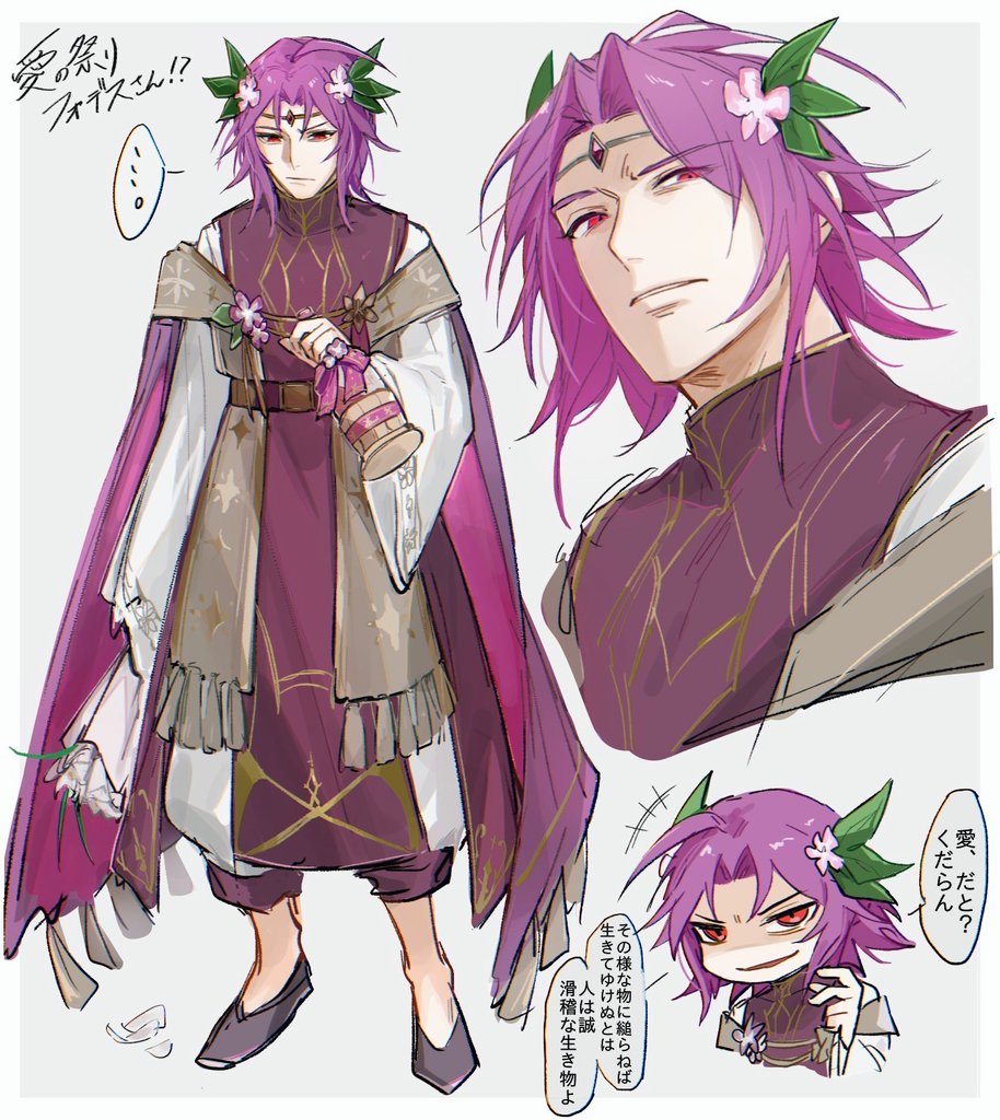 ... 1boy ahoge belt black_shoes border bottle brown_belt cape chibi chromatic_aberration circlet confused corruption cropped_shoulders curtained_hair dark_persona evil_smile fire_emblem fire_emblem:_the_sacred_stones fire_emblem_heroes flats flower fomortiis_(fire_emblem) full_body furrowed_brow gem hair_flower hair_ornament hanaura_02 high_collar holding holding_bottle looking_at_viewer lyon_(fire_emblem) lyon_(valentine)_(fire_emblem) male_focus multiple_views nintendo official_alternate_eye_color outside_border pants parted_bangs petals pink_flower possessed possession purple_cape purple_flower purple_hair purple_pants purple_tabard red_eyes red_gem robe shaded_face shoes short_hair smile spoken_ellipsis stole tabard v-shaped_eyebrows white_background white_border white_petals white_robe wide_sleeves