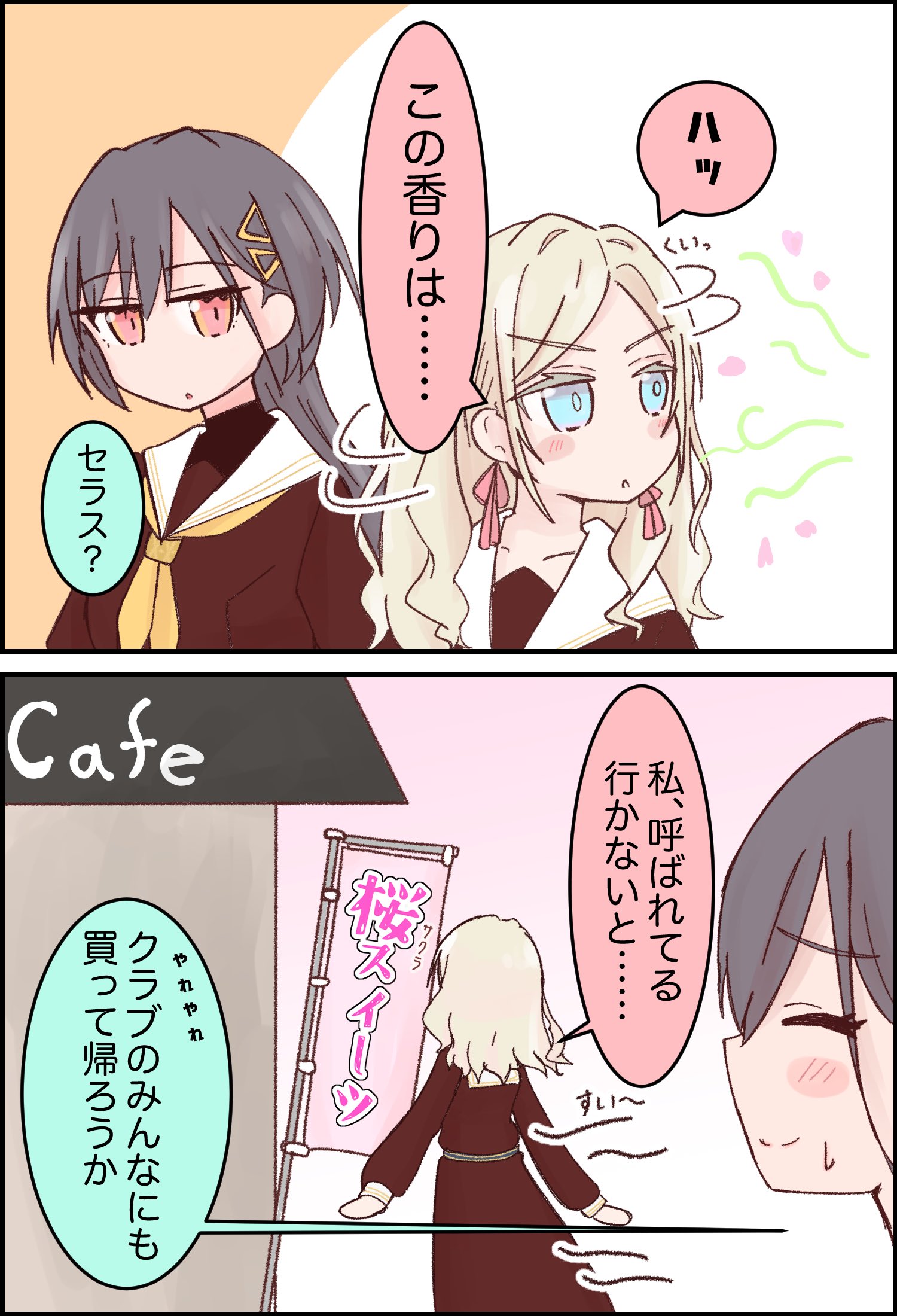 2girls ^_^ amado_(amaddo_club) banner blush_stickers brown_dress ceras_yanagida_lilienfeld closed_eyes closed_mouth colored_speech_bubble commentary_request dress edel_note hair_ornament hasu_no_sora_school_uniform highres katsuragi_izumi link!_like!_love_live! long_sleeves love_live! motion_lines multiple_girls neckerchief nobori profile raised_inner_eyebrows sailor_collar sailor_dress school_uniform sideways_mouth smile speech_bubble triangle_hair_ornament virtual_youtuber white_sailor_collar winter_uniform yellow_neckerchief