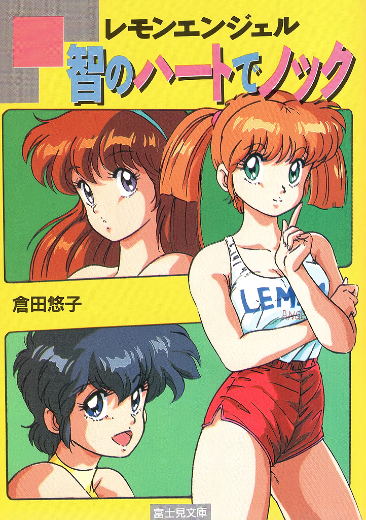 1980s_(style) 3girls black_hair blue_eyes clothes_writing cover cover_page emoto_miki finger_to_cheek green_eyes hairband long_hair looking_at_viewer midnight_anime_lemon_angel multiple_girls non-web_source official_art oldschool open_mouth orange_hair red_hair red_shorts retro_artstyle sakurai_tomo shima_erika short_hair short_shorts shorts side_slit smile tank_top translation_request twintails