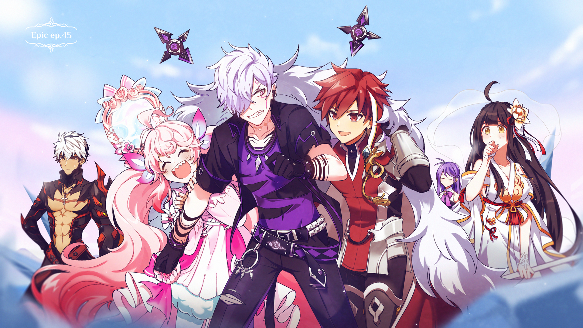 3boys 3girls abs add_(elsword) aether_sage_(elsword) ahoge aisha_landar apsara_(elsword) ara_haan armor bare_pectorals belt black_armor black_hair black_jacket black_pants blue_sky blurry blurry_background blurry_foreground breasts closed_eyes depth_of_field detached_sleeves doom_bringer_(elsword) dress elsword elsword_(character) faulds flower hagoromo hair_flower hair_ornament hair_over_one_eye highres jacket jewelry knight_emperor_(elsword) laby_(elsword) long_hair male_focus multicolored_hair multiple_boys multiple_girls necklace open_mouth pants pectorals pink_dress pink_eyes pink_hair purple_hair purple_shirt radiant_soul_(elsword) rage_hearts_(elsword) raven_cronwell red_eyes red_hair red_shirt sasa_(sa1008va) shawl shirt short_hair short_sleeves sky streaked_hair teeth toned toned_male twintails vambraces very_long_hair white_dress white_flower white_hair yellow_eyes