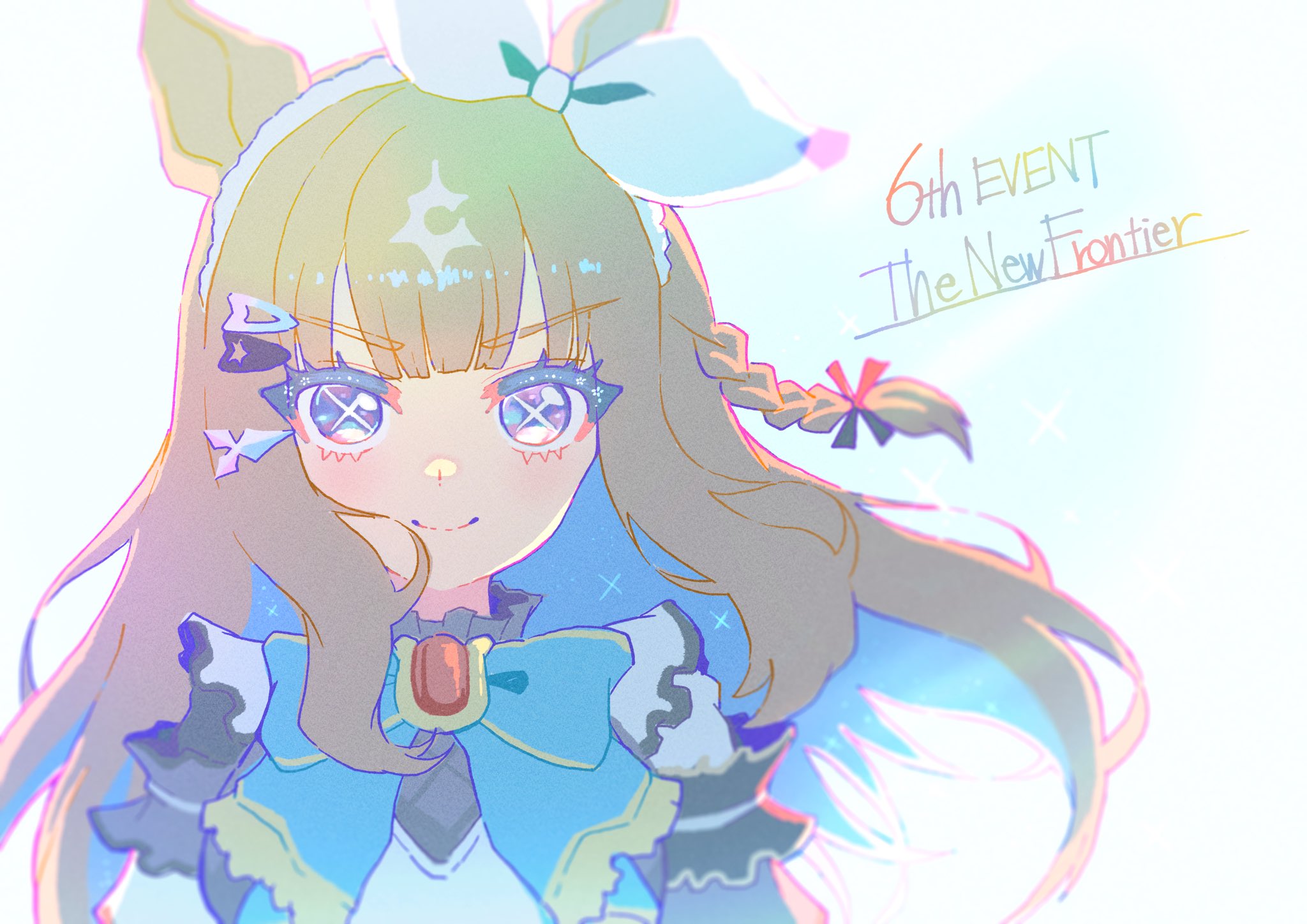 1girl almond_eye_(umamusume) animal_ears blue_eyes brown_hair colored_inner_hair hair_between_eyes hair_ornament hairband hairclip highres horse_ears horse_girl long_hair looking_at_viewer multicolored_hair nenbutsu_0416 official_alternate_costume smile solo symbol-shaped_pupils trailblazer_bash!_(umamusume) umamusume upper_body white_hairband x-shaped_pupils