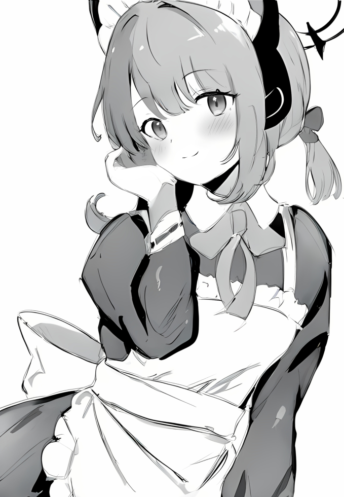 1girl animal_ear_headphones animal_ears apron blue_archive bow collared_dress dress fake_animal_ears frilled_apron frills greyscale hair_ribbon halo hand_up headphones light_blush light_smile long_sidelocks long_sleeves looking_at_viewer maid maid_apron maid_headdress medium_hair midori_(blue_archive) midori_(maid)_(blue_archive) monochrome official_alternate_costume official_alternate_hairstyle ponytail raifu_(rf) ribbon sidelocks solo tucking_hair upper_body