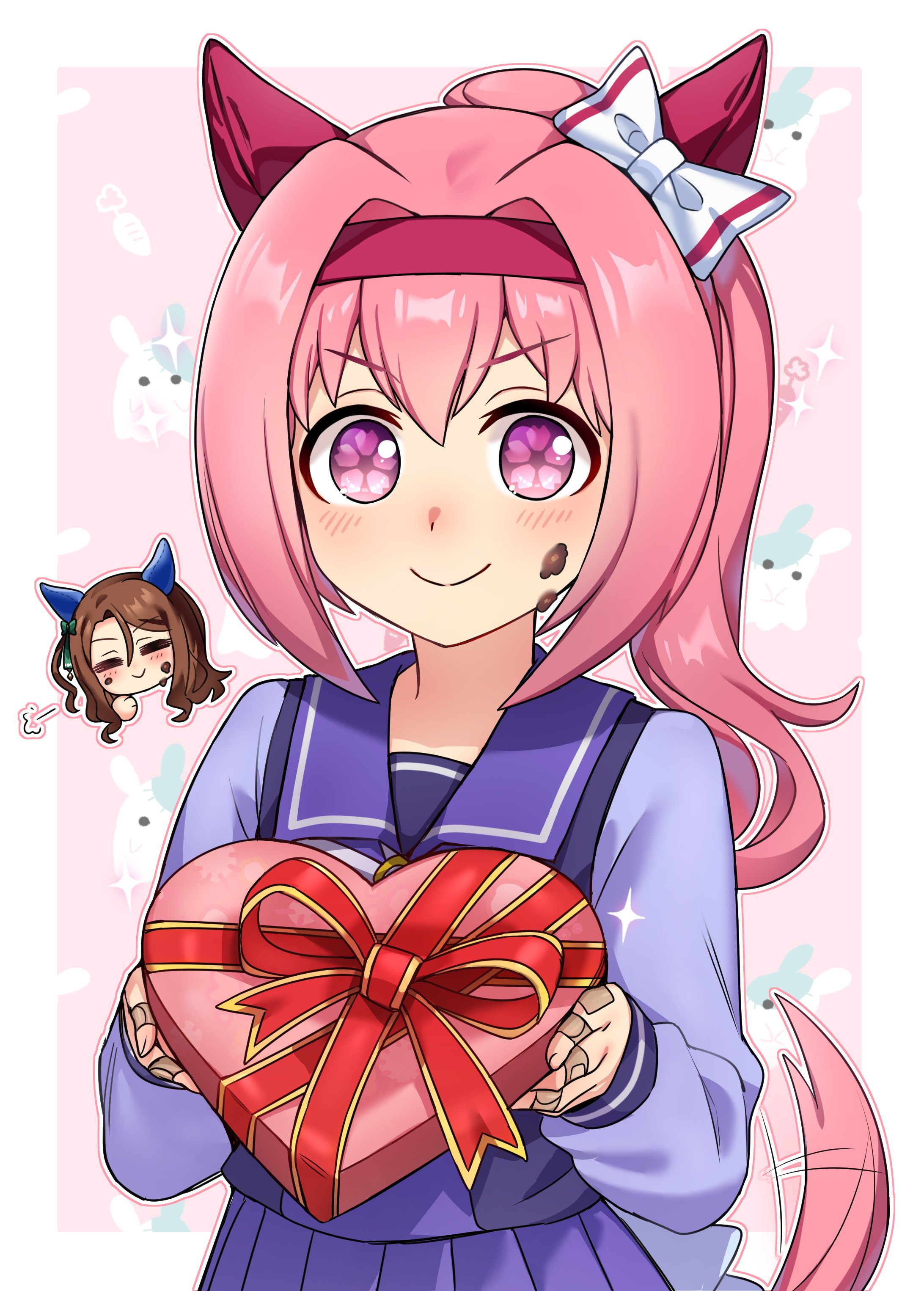 2girls :> =_= absurdres animal_ears border box brown_hair chibi ear_covers flower_in_eye gift gift_box hairband haru_urara_(umamusume) heart-shaped_box highres holding holding_box holding_gift horse_ears horse_girl horse_tail king_halo_(umamusume) long_hair long_sleeves looking_at_viewer multiple_girls pink_hair pink_hairband pleated_skirt ponytail purple_eyes purple_serafuku purple_shirt purple_skirt ress_beep sailor_collar sailor_shirt school_uniform serafuku shirt skirt smile solo_focus symbol_in_eye tail tail_wagging tracen_school_uniform umamusume valentine white_border