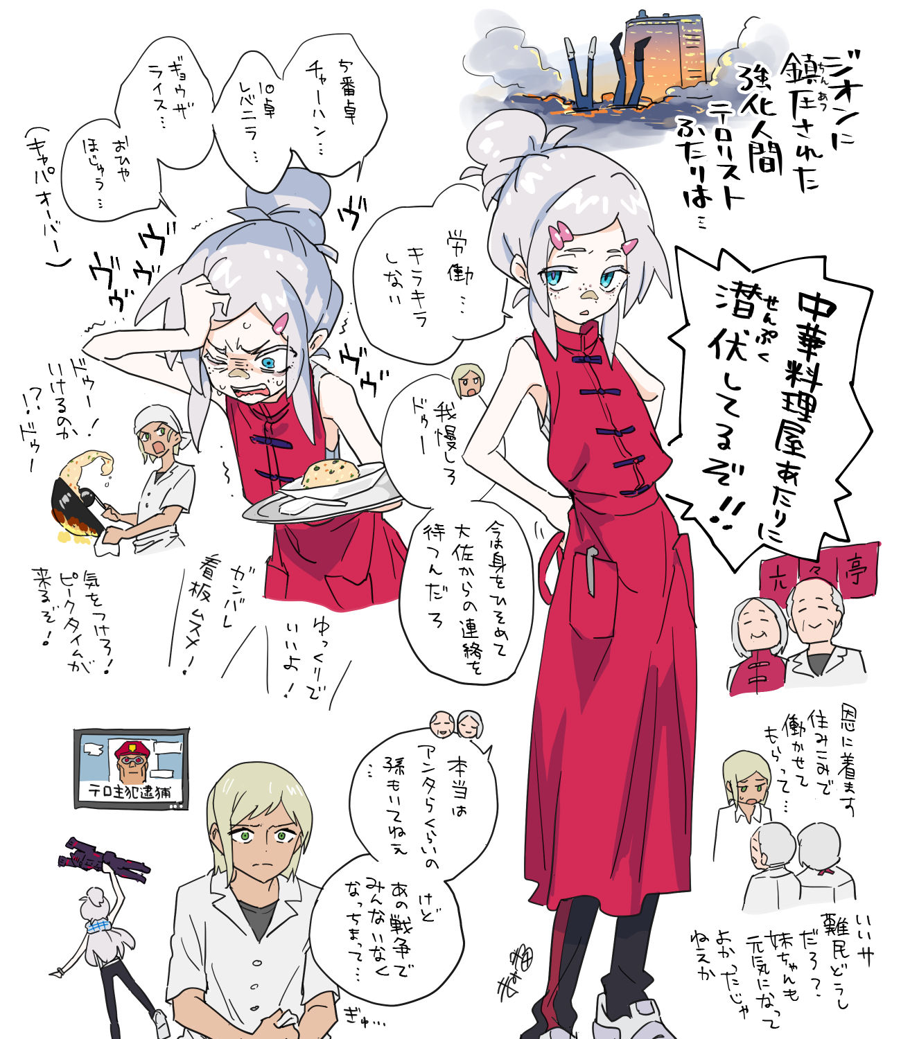 apron bandaid bandaid_on_face bandaid_on_nose bask_om blonde_hair cooking deux_murasame food fried_rice frying_pan gates_capa green_eyes gundam gundam_gquuuuuux highres miman psycho_gundam_(gquuuuuux) red_apron speech_bubble sweat translation_request white_hair wok