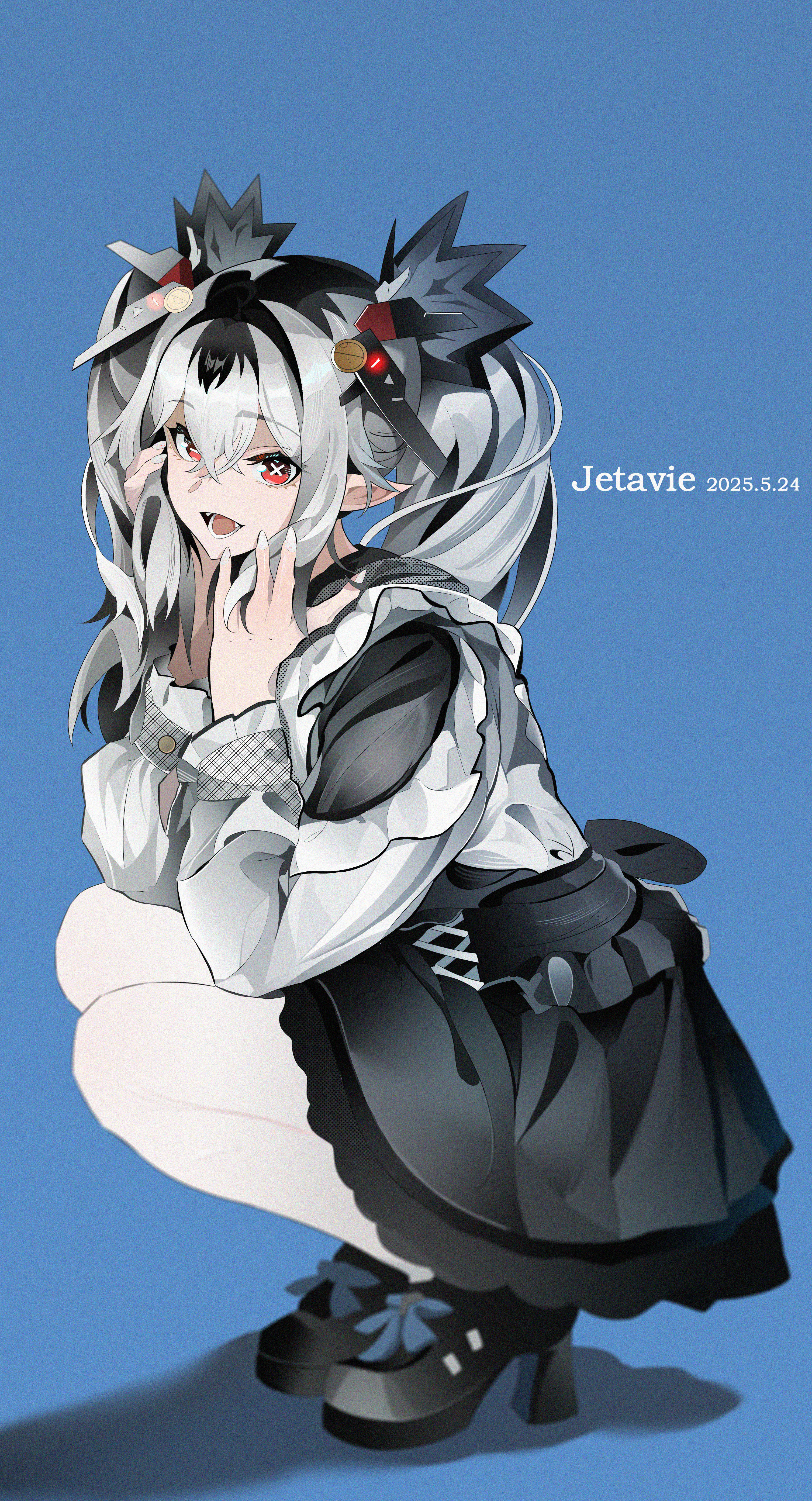 1girl absurdres black_hair black_shoes black_skirt blue_background character_name dated fang fley-lan frilled_shirt frills grey_hair hair_intakes hair_ornament headgear high_heels highres jetavie_(pgr) looking_at_viewer mismatched_pupils multicolored_hair open_mouth playing_with_own_hair pointy_ears punishing:_gray_raven red_eyes shirt shoes sidelocks skirt slit_pupils solo streaked_hair symbol-shaped_pupils twintails white_nails white_shirt x-shaped_pupils