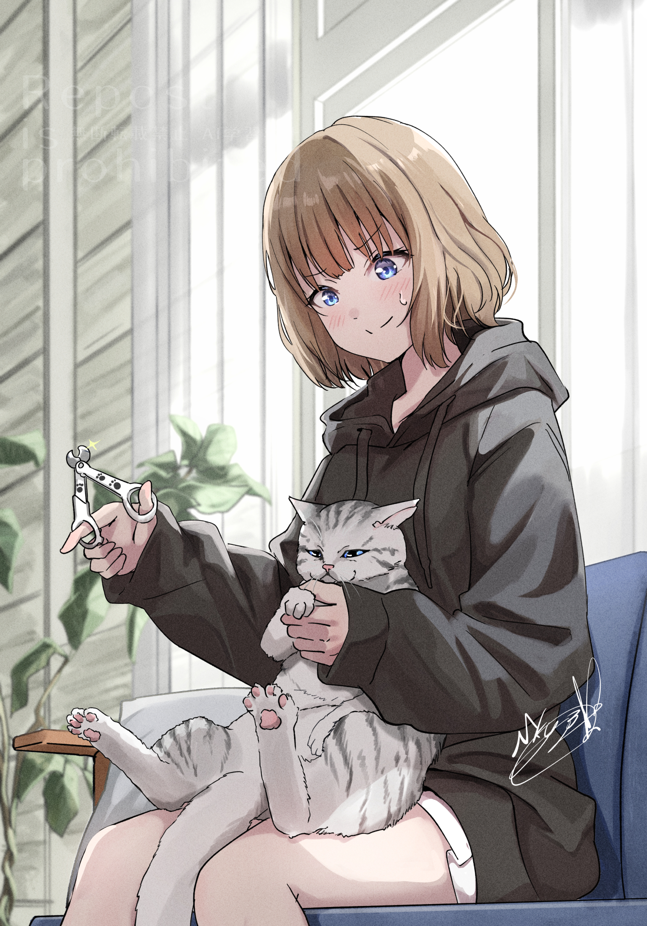 1girl animal animal_on_lap black_hoodie blue_eyes brown_hair cat commentary_request couch cowboy_shot facing_viewer highres holding hood hood_down hoodie indoors long_sleeves on_couch on_lap original pet_nail_clippers plant short_hair shorts signature sitting smile solo soragane_(banisinngurei) sweatdrop watermark white_shorts window wooden_wall
