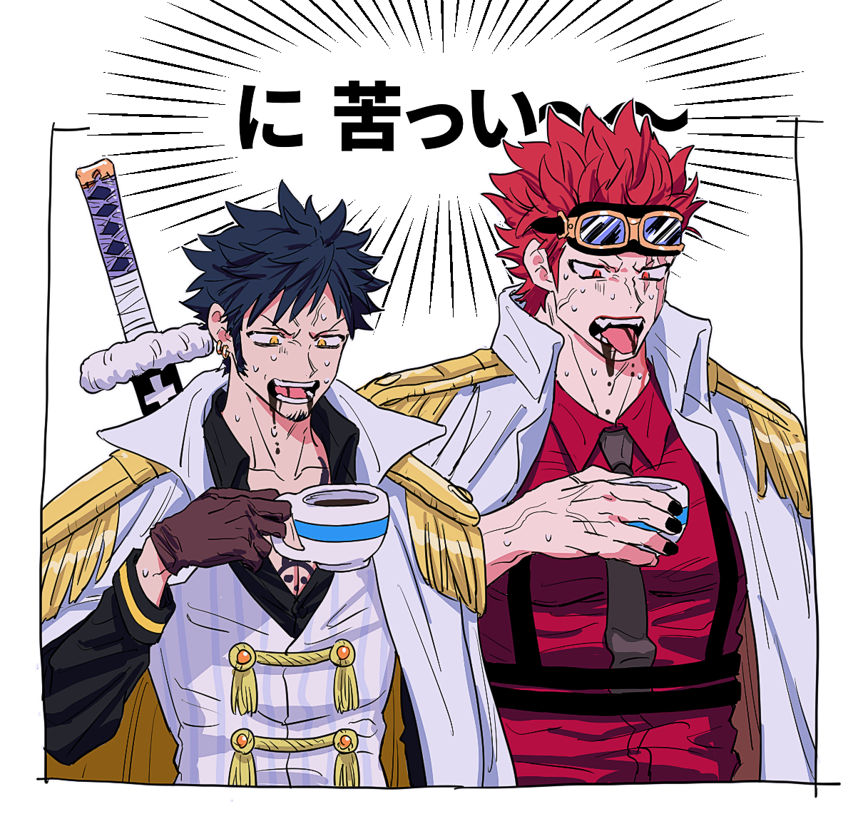 2boys black_hair black_nails black_shirt buttons chest_harness chest_tattoo coat coat_on_shoulders coffee coffee_mug collarbone collared_coat collared_shirt commentary_request cup disgust earrings emphasis_lines epaulettes eustass_kid facial_hair fingernails goatee goggles goggles_on_head gold_earrings grey_necktie hand_up harness holding holding_cup jewelry long_sleeves male_focus marine_uniform_(one_piece) mug multiple_boys nail_polish necktie one_piece open_collar open_mouth pectoral_cleavage pectorals red_eyes red_hair red_shirt sheath sheathed shirt short_hair sideburns simple_background sleeve_cuffs spiked_hair striped_clothes striped_vest sweat sword tassel tattoo teeth tongue tongue_out trafalgar_law translation_request upper_body v-shaped_eyebrows veins vertical-striped_clothes vertical-striped_vest vest weapon white_background white_coat white_vest yakumo_(ykm) yellow_eyes
