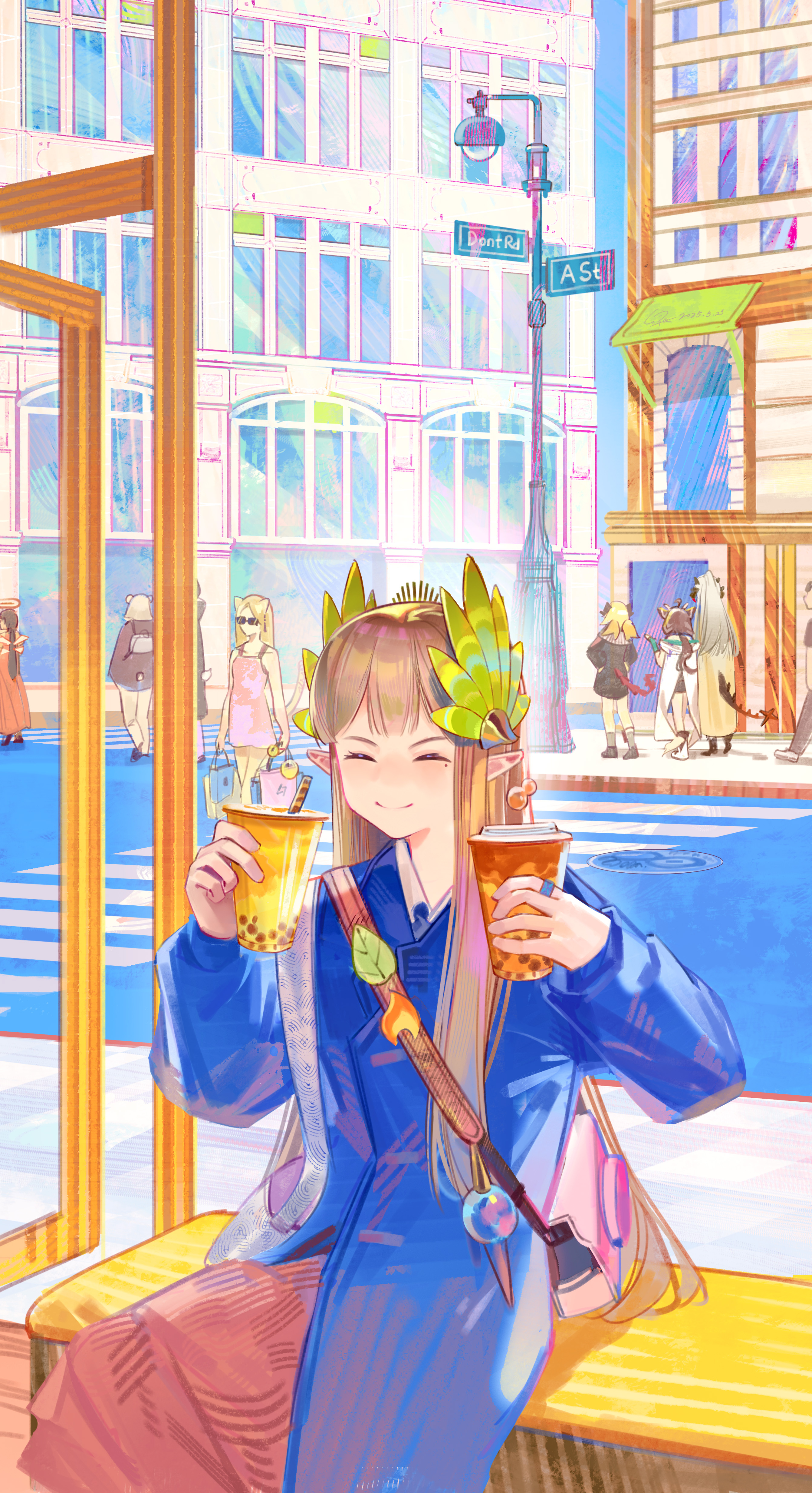 2boys 6+girls absurdres alternate_costume arknights back blonde_hair blue_coat brown_hair character_request city closed_mouth coat cup grey_hair highres holding holding_cup ifrit_(arknights) ifrit_(lone_trail)_(arknights) lyuqiu muelsyse_(arknights) multiple_boys multiple_girls pointy_ears scenery silence_(arknights) sitting smile solo_focus tail walking