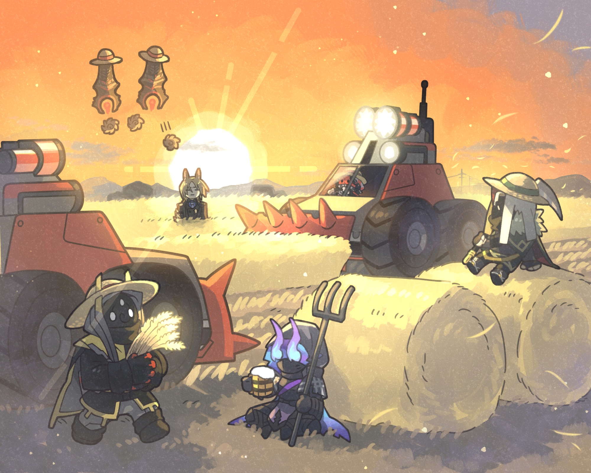 5boys animal_ears arknights beer_mug black_gloves black_jacket black_mask black_shirt blonde_hair closed_eyes combine_harvester commentary_request cup gloves grey_pants hat hay_bale highres holding_wheat horns horns_through_headwear jacket long_sleeves male_focus mask mlynar_(arknights) morini_ochiteru mountainous_horizon mug multiple_boys necktie on_ground outdoors pants pitchfork red_mask scythe sheaf shirt sitting straw_hat sunset utility_pole wheat_field