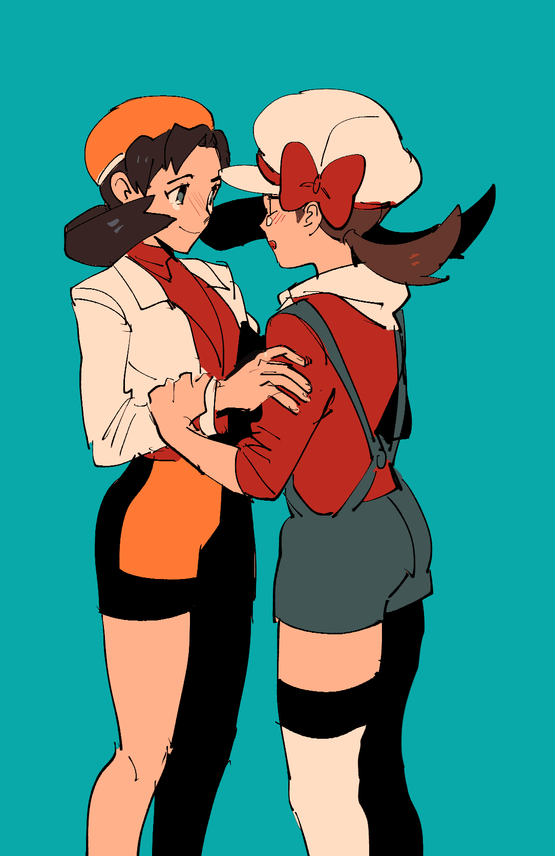 2girls blue_background blue_eyes blue_overalls brown_hair cropped_jacket hand_on_another's_arm hat highres kendy_(revolocities) kris_(pokemon) lyra_(pokemon) multiple_girls newsboy_cap nintendo overalls pokemon pokemon_gold/silver/crystal pokemon_heartgold_and_soulsilver simple_background tears thighhighs yellow_hat