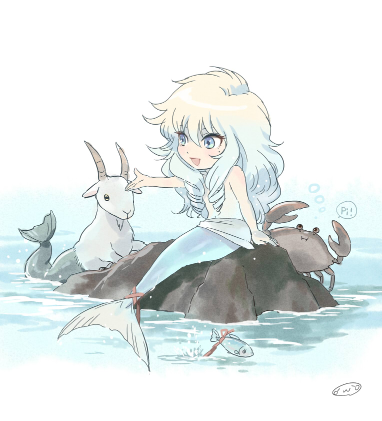 1boy animal animalization blonde_hair blue_eyes blue_hair cancer_(zodiac) cancer_death_mask capricorn_(zodiac) capricorn_shura crab fish goat gradient_hair hand_up long_hair male_focus merfolk mermaid merman mizuhara_aki mole mole_on_cheek monster_boy monster_girl multicolored_hair navel on_rock pisces_(zodiac) pisces_aphrodite red_ribbon ribbon ringlets saint_seiya sitting solo_focus speech_bubble tail tail_ornament tail_ribbon topless_male trap two-tone_hair water zodiac