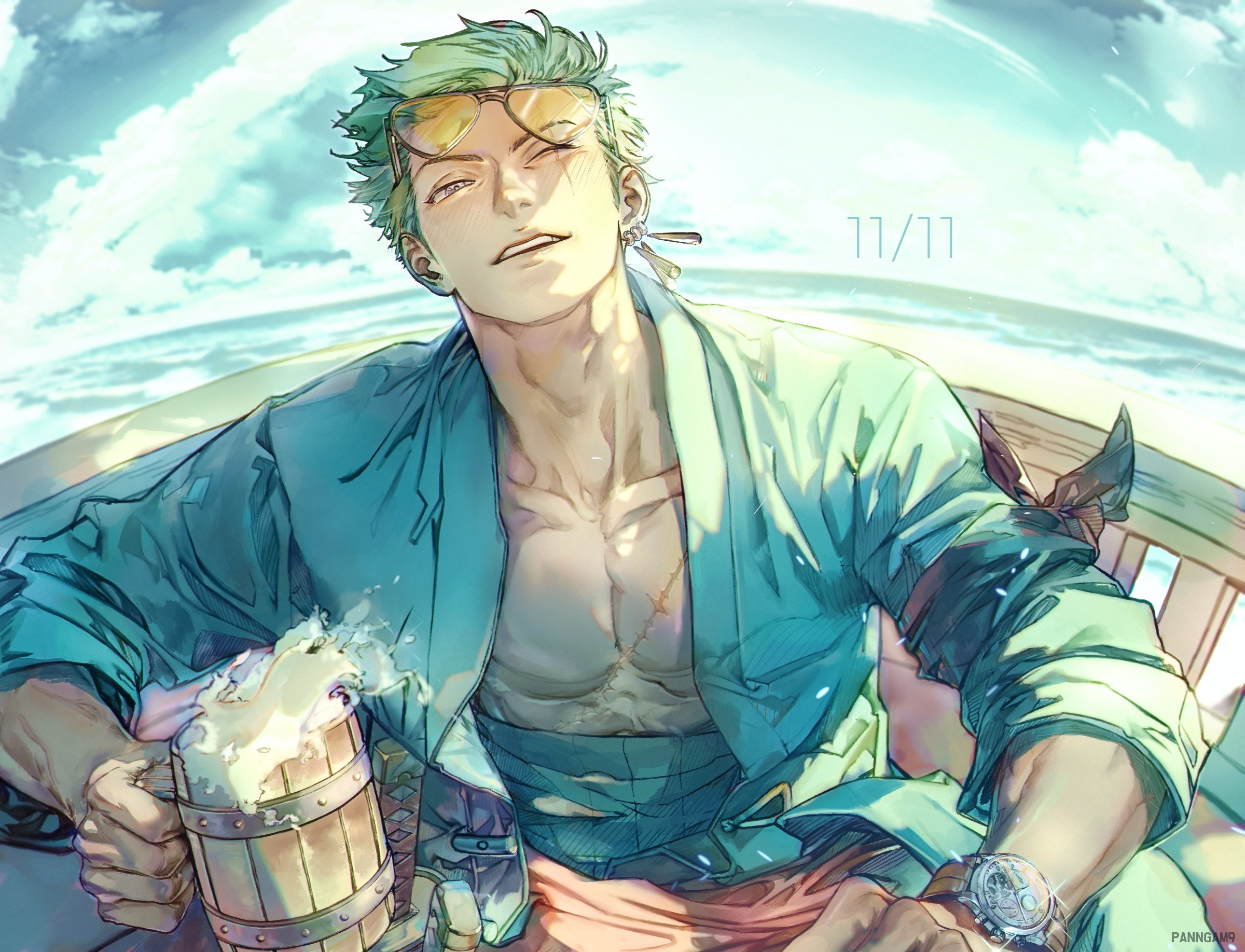 1boy bandana_around_arm blush commentary cup dated earrings glint green_hair green_kimono haramaki hashtag-only_commentary highres holding holding_cup japanese_clothes jewelry kimono looking_at_viewer male_focus one_eye_closed one_piece outdoors panngam9 roronoa_zoro scar scar_across_eye scar_on_face smile solo stitched_torso stitches sunglasses untranslatable_commentary tinted_eyewear watch wristwatch yellow-tinted_eyewear