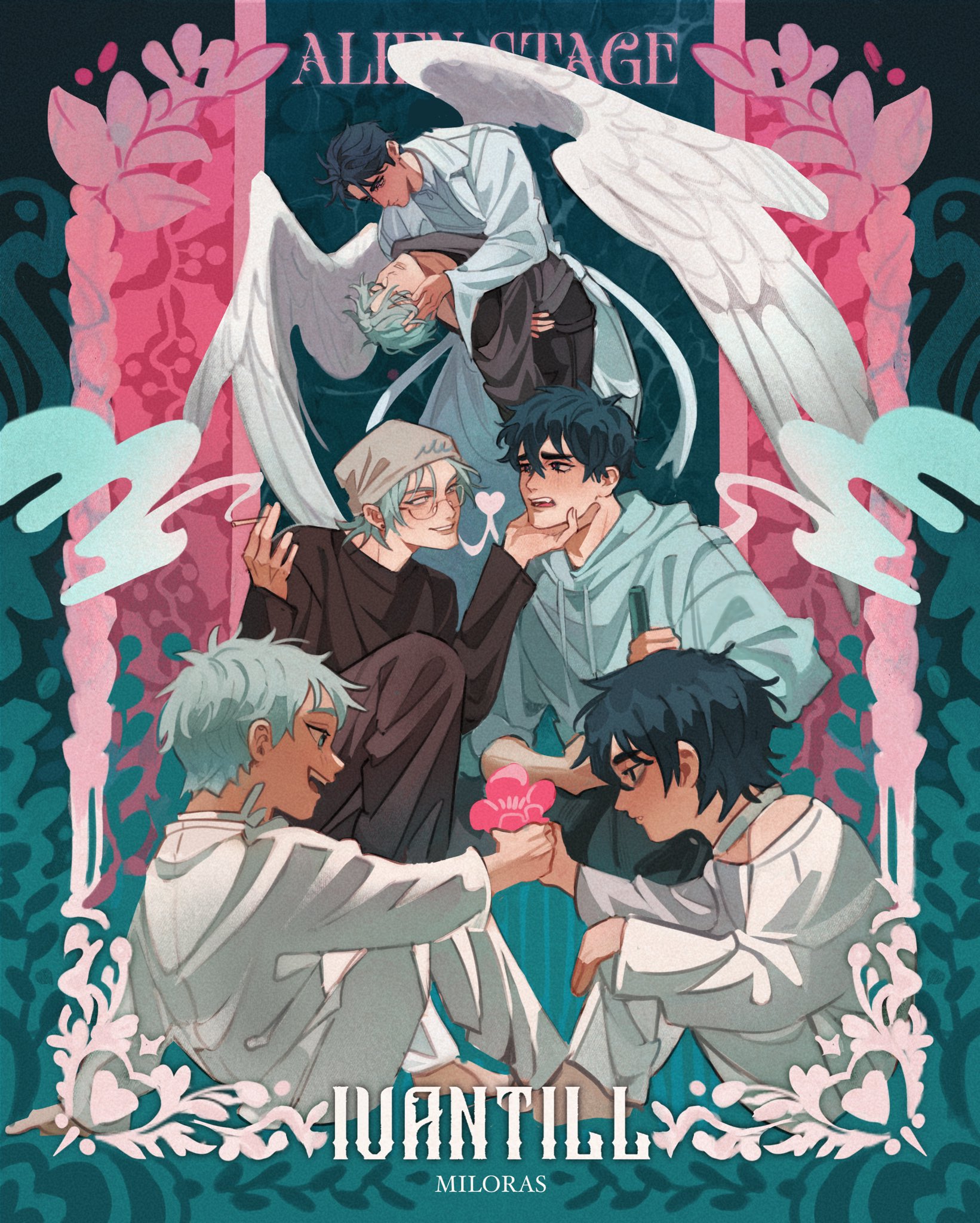 2boys aged_down alien_stage angel_wings angrymiloras artist_name beanie between_fingers black_eyes black_hair black_shirt cigarette coat commentary copyright_name english_commentary feathered_wings flower giving_flower glasses green_eyes grey_hair grey_hoodie hand_on_another's_chin hat heart highres holding holding_cigarette holding_flower hood hoodie ivan_(alien_stage) male_focus multiple_boys multiple_views open_mouth pants pink_flower pairing_name shirt short_hair smile smoke till_(alien_stage) very_short_hair white_coat white_pants white_wings wings