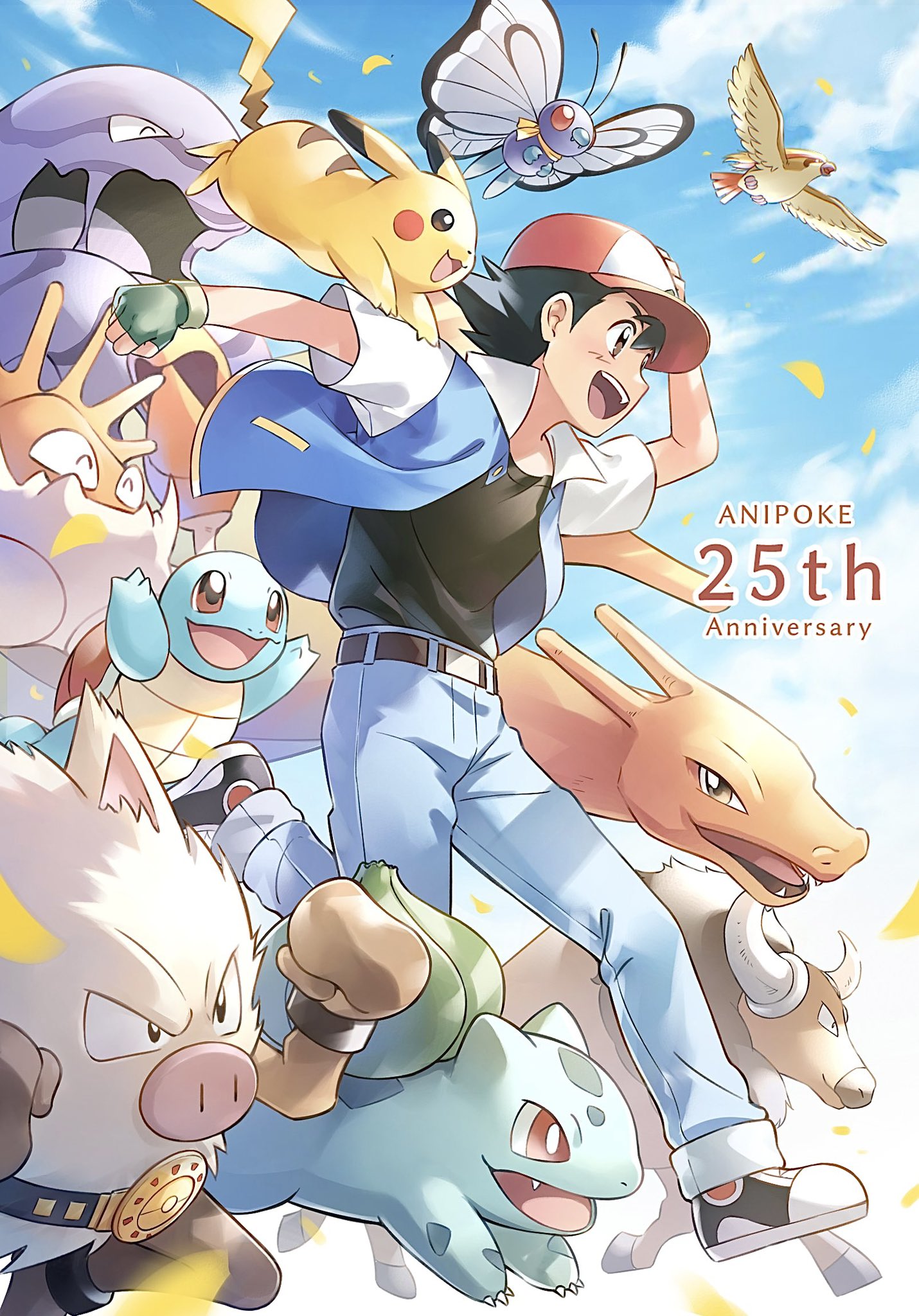 1boy anniversary ash_ketchum bird black_hair black_shoes blue_jacket blue_pants blue_sky brown_eyes bulbasaur butterfree charizard cloud commentary_request denim fingerless_gloves gen_1_pokemon gloves green_gloves hand_on_own_head hat highres jacket jeans kingler male_focus muk nintendo pants pidgeot pikachu pokemon pokemon_(anime) pokemon_(classic_anime) primeape red_hat shoes short_sleeves sky squirtle tauros usao_(313131)