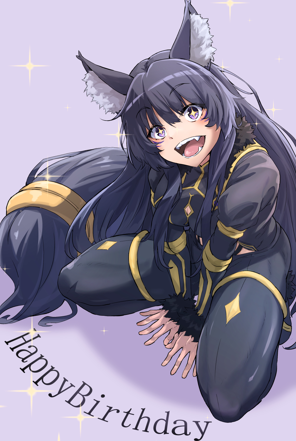 1girl animal_ear_fluff animal_ears black_hair single_breast_curtain breasts delta_(kagejitsu) facial_mark fangs hair_between_eyes highres itsudzumi kage_no_jitsuryokusha_ni_naritakute! long_hair looking_at_viewer open_mouth purple_eyes smile solo sparkling_eyes tagme tail whisker_markings wolf_ears wolf_girl wolf_tail