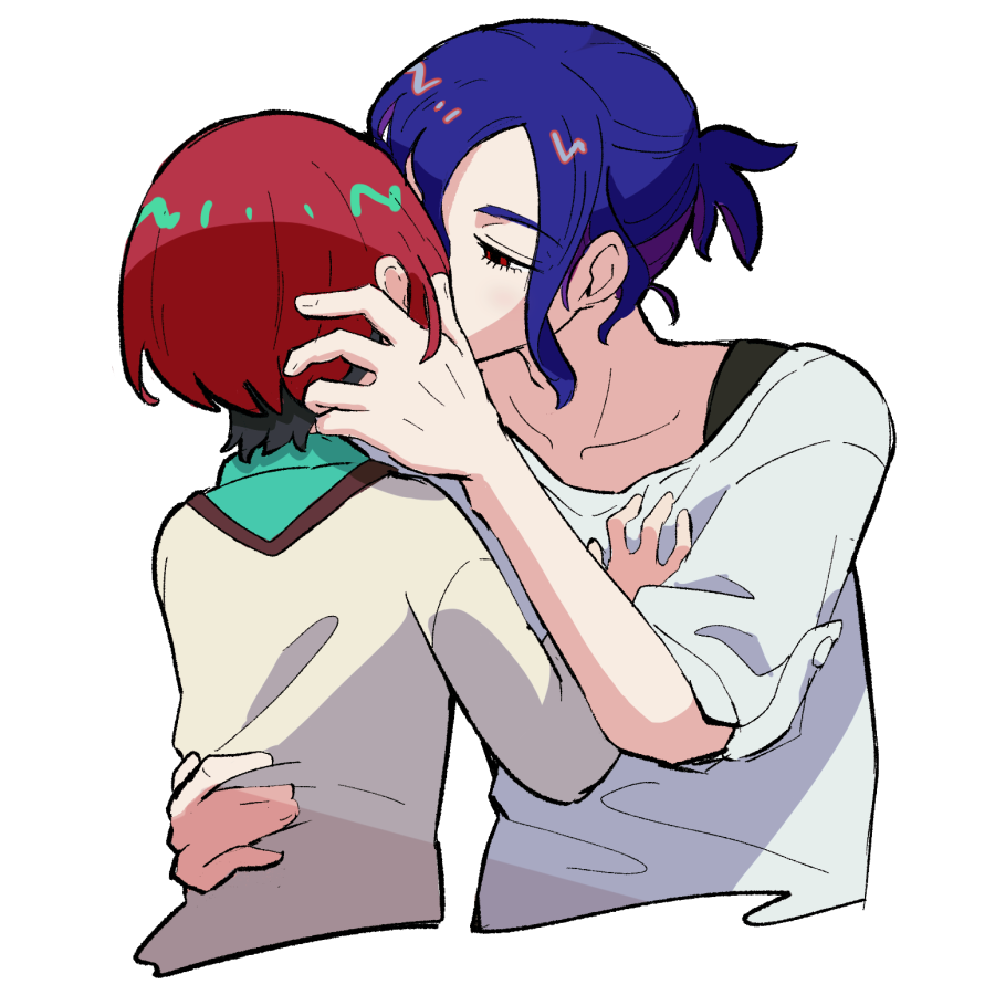 1boy 1girl amate_yuzuriha aqua_eyes black_hair blue_hair colored_inner_hair gundam gundam_gquuuuuux half-closed_eyes hetero kiss lower_eyelashes_only multicolored_hair ponytail purple_hair rasube_(yfjwbmrrbjw0oey) red_eyes red_hair school_uniform shirt short_hair shuji_ito simple_background sweater two-tone_hair white_background white_shirt