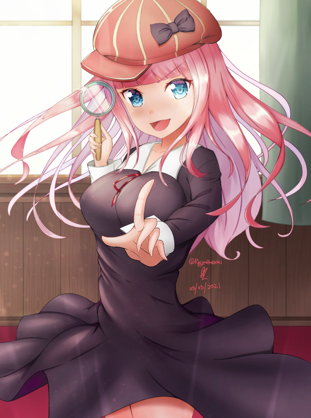 1girl blue_eyes breasts fujiwara_chika hat highres kaguya-sama_wa_kokurasetai_~tensai-tachi_no_renai_zunousen~ large_breasts long_hair long_sleeves magnifying_glass open_mouth pink_hair raijinhikari school_uniform skirt sunlight window wooden_wall