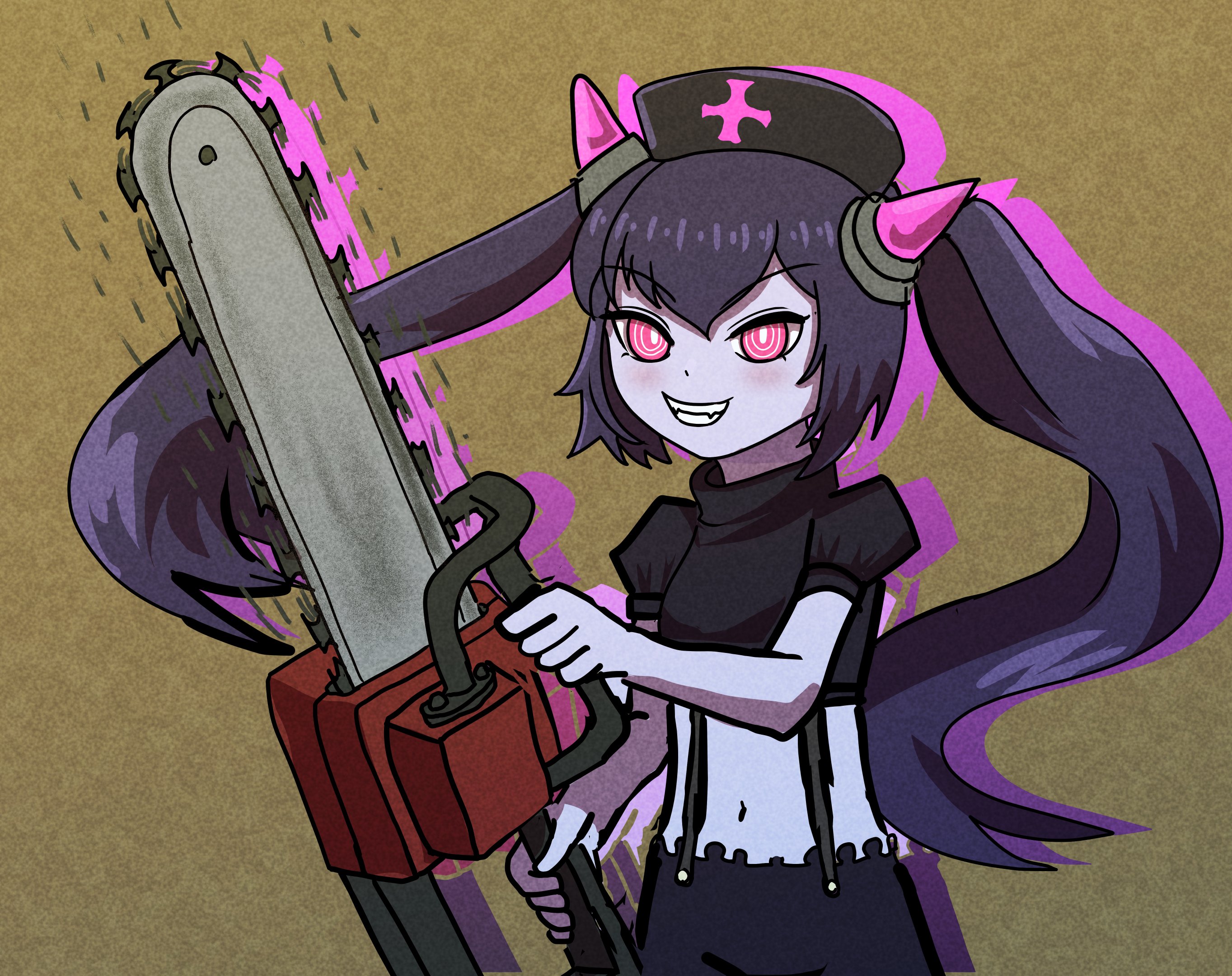 1girl black_hair black_hat black_shirt black_shorts brown_background chainsaw chrome_(mon-musu_quest!) colored_skin commentary_request crop_top cross demon_girl fangs foxmofumofu grin hair_between_eyes hat highres holding holding_chainsaw horns light_blush long_hair mon-musu_quest! motion_lines nurse_cap pink_eyes pink_horns puffy_short_sleeves puffy_sleeves purple_skin red_cross ringed_eyes shirt short_sleeves shorts simple_background smile suspender_shorts suspenders twintails upper_body v-shaped_eyebrows very_long_hair