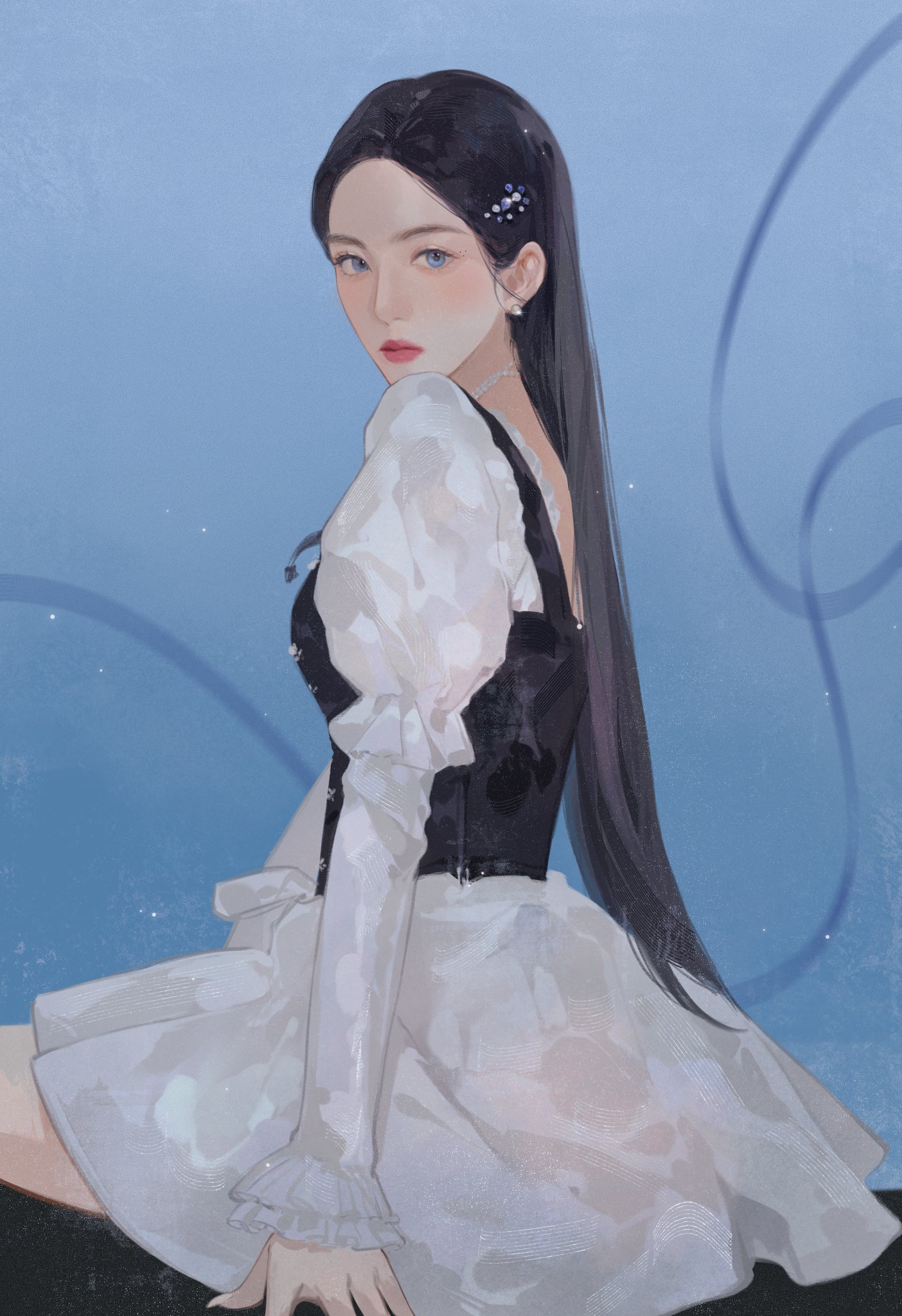 1girl black_hair blue_background blue_eyes closed_mouth commentary earrings feel_my_rhythm_(red_velvet) hair_behind_ear hashtag-only_commentary highres irene_(red_velvet) jewelry k-pop long_hair long_sleeves looking_at_viewer necklace pearl_earrings profile puffy_sleeves real_life red_velvet_(group) sitting solo untranslatable_commentary yuanwei_shaoya