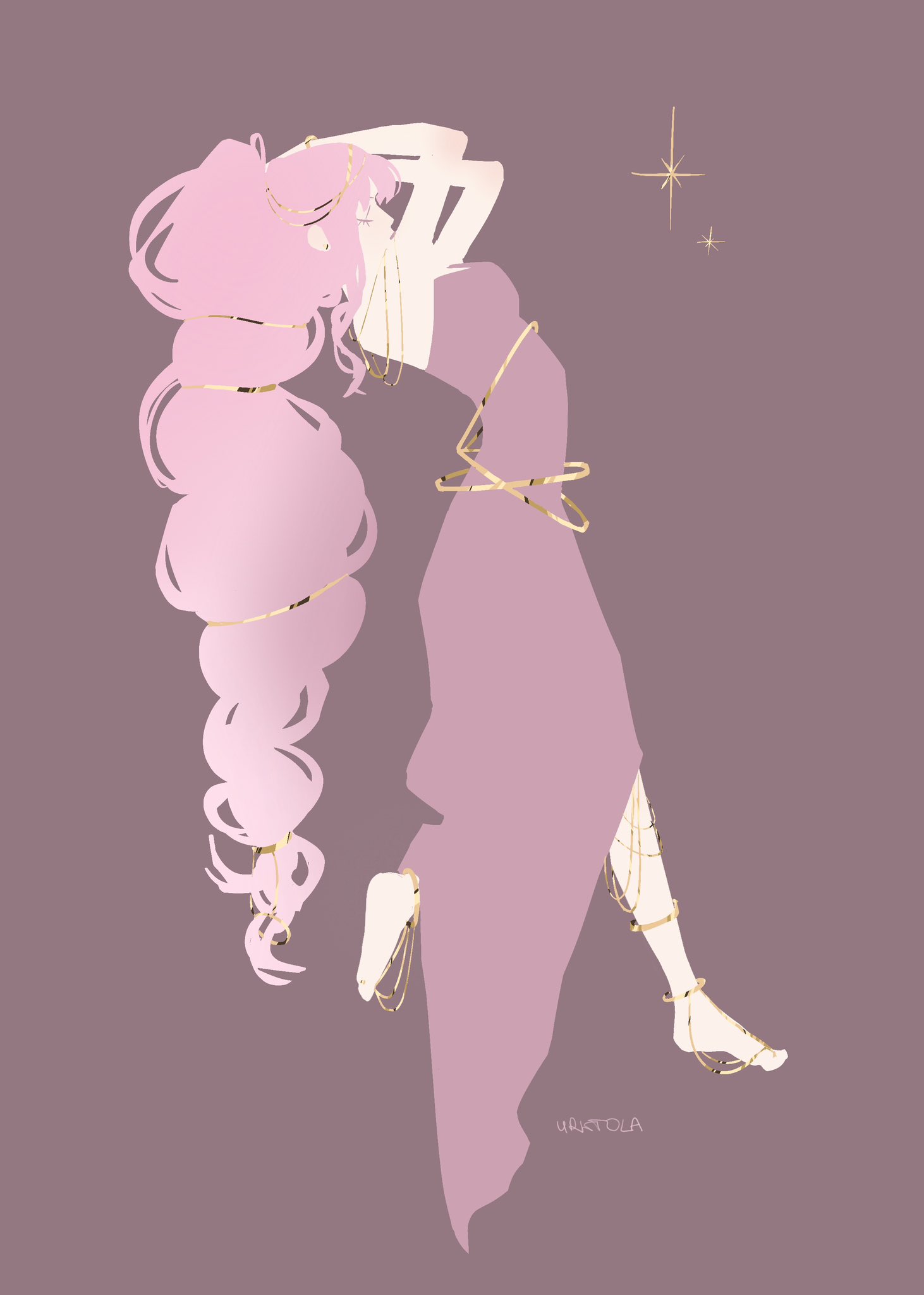 1girl artist_name bare_shoulders closed_eyes commentary dress english_commentary full_body highres long_hair off-shoulder_dress off_shoulder one_piece perona pink_hair profile simple_background solo sparkle urktola very_long_hair