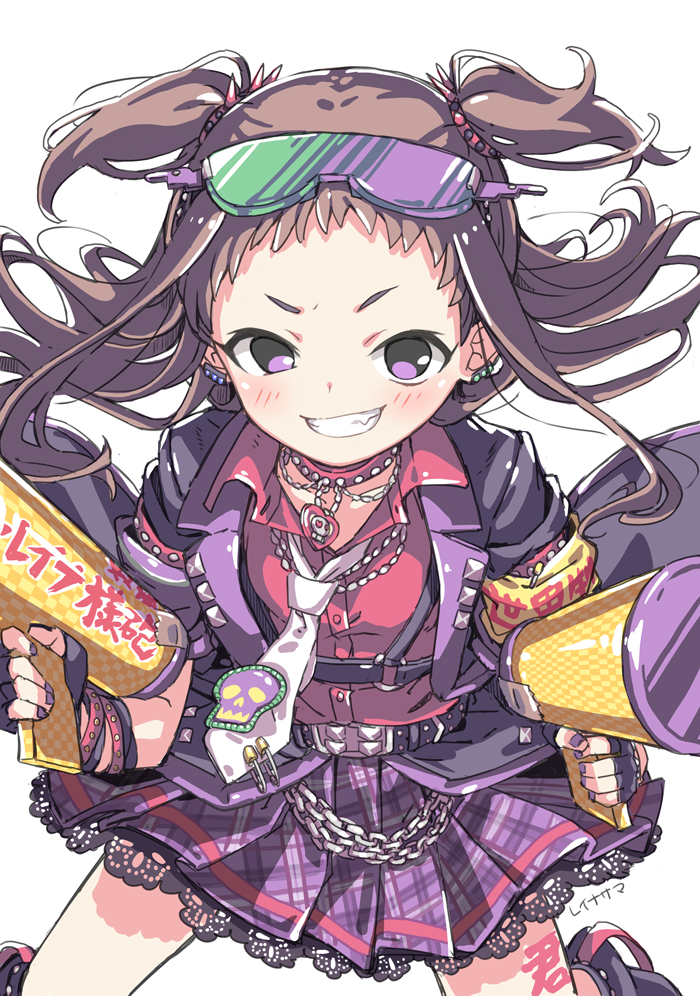 1girl armband black_gloves black_jacket brown_hair choker collared_shirt cowboy_shot dress_shirt eyewear_on_head fang fingerless_gloves floating_hair gloves grin heart heart_necklace idolmaster idolmaster_cinderella_girls jacket jewelry koseki_reina kuresuku_(lessons) long_hair long_sidelocks long_sleeves looking_at_viewer necklace necktie open_clothes open_jacket plaid_clothes plaid_skirt purple_eyes purple_nails purple_skirt red_choker red_shirt shirt short_bangs sidelocks skirt smile solo studded_choker sunglasses tie_clip two_side_up white_background white_necktie yellow_armband
