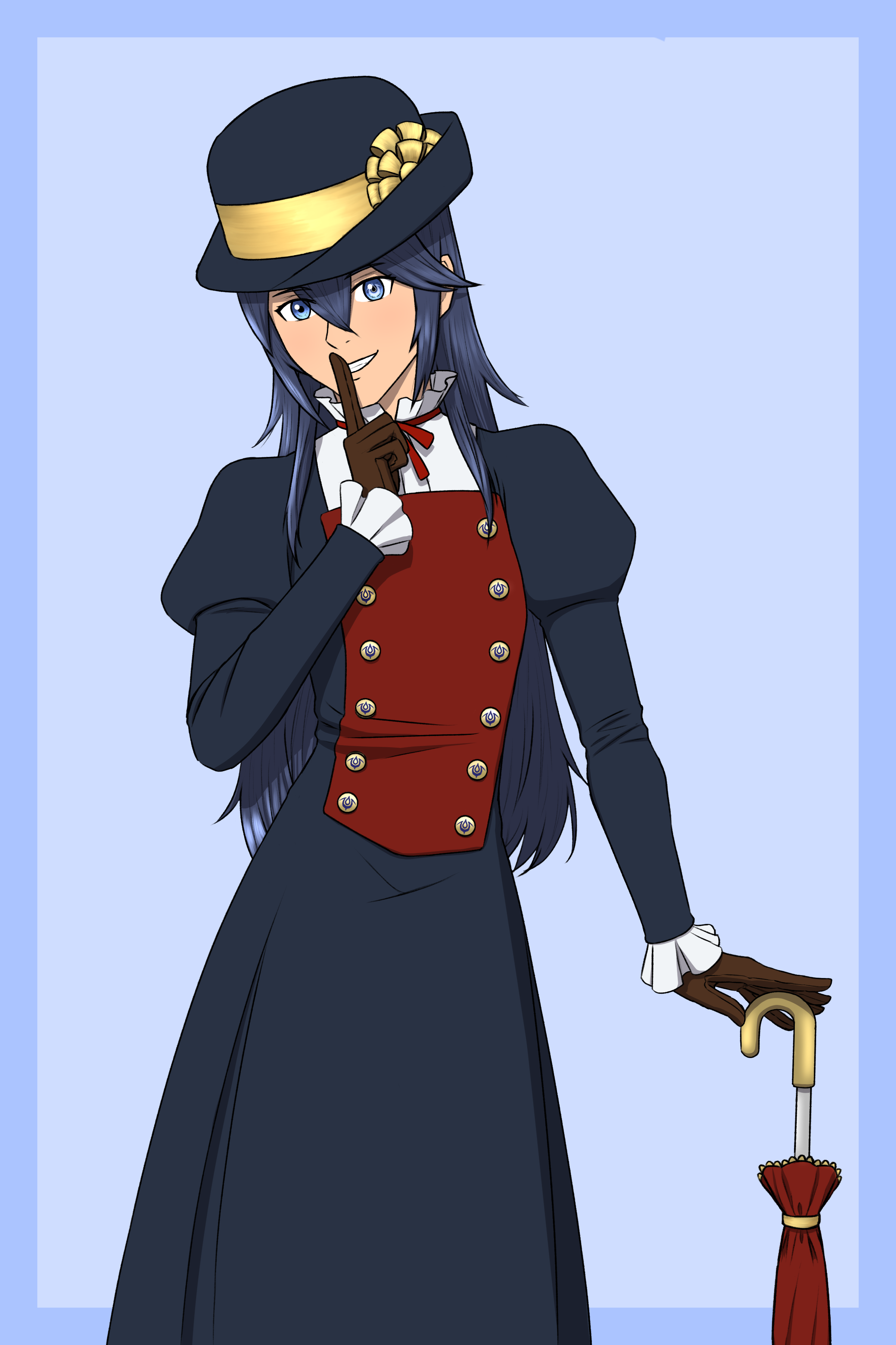1girl absurdres blue_background blue_dress blue_eyes blue_hair blue_hat brown_gloves commentary commission cosplay devil_summoner:_soul_hackers devil_summoner_(series) dress english_commentary finger_to_mouth fire_emblem fire_emblem_awakening fseffect gloves hair_between_eyes hat highres lucina_(fire_emblem) mayone_(soul_hackers) mayone_(soul_hackers)_(cosplay) nintendo shin_megami_tensei simple_background smile solo umbrella