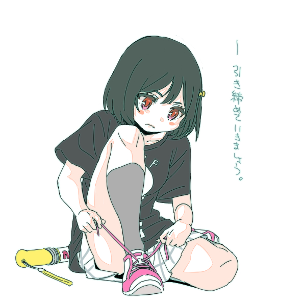 1girl black_hair black_shirt blush_stickers bob_cut closed_mouth commentary_request double-parted_bangs fang fang_out full_body glowstick love_live! love_live!_nijigasaki_high_school_idol_club medium_hair mifune_shioriko miniskirt official_alternate_costume orange_eyes penlight_(glowstick) pink_shoes plaid_clothes plaid_skirt pleated_skirt shinanoya_(satanicad) shirt shoes short_sleeves sif_staff_shirt simple_background skirt sneakers solo t-shirt translation_request tying_footwear white_background white_skirt